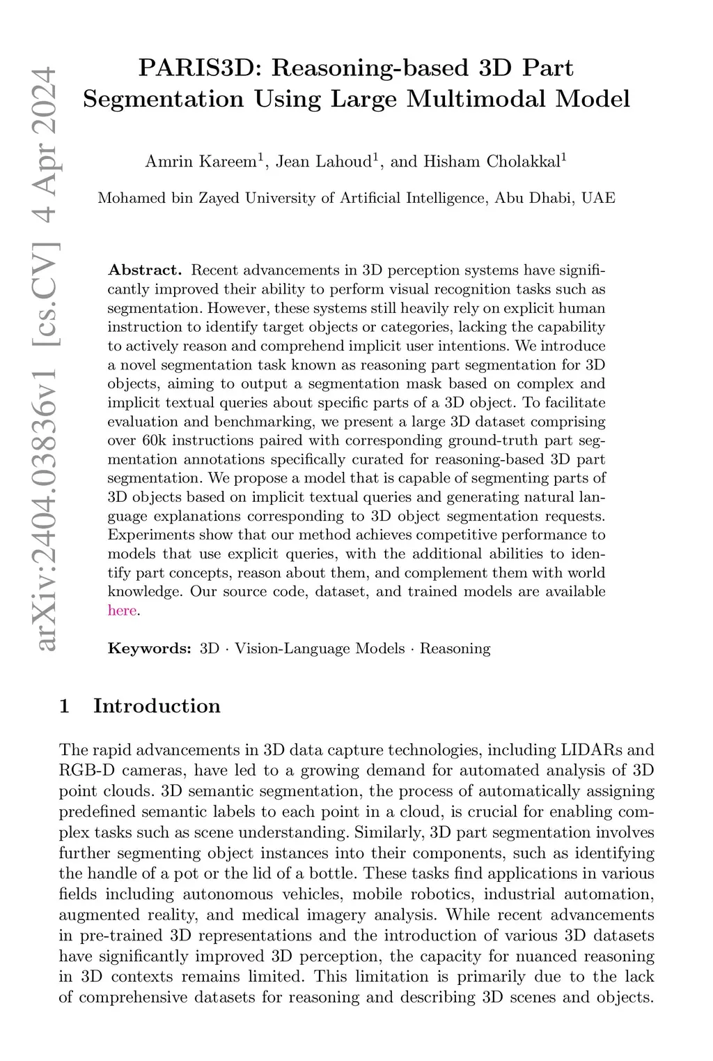 PARIS3D: Reasoning-based 3D Part Segmentation Using Large Multimodal