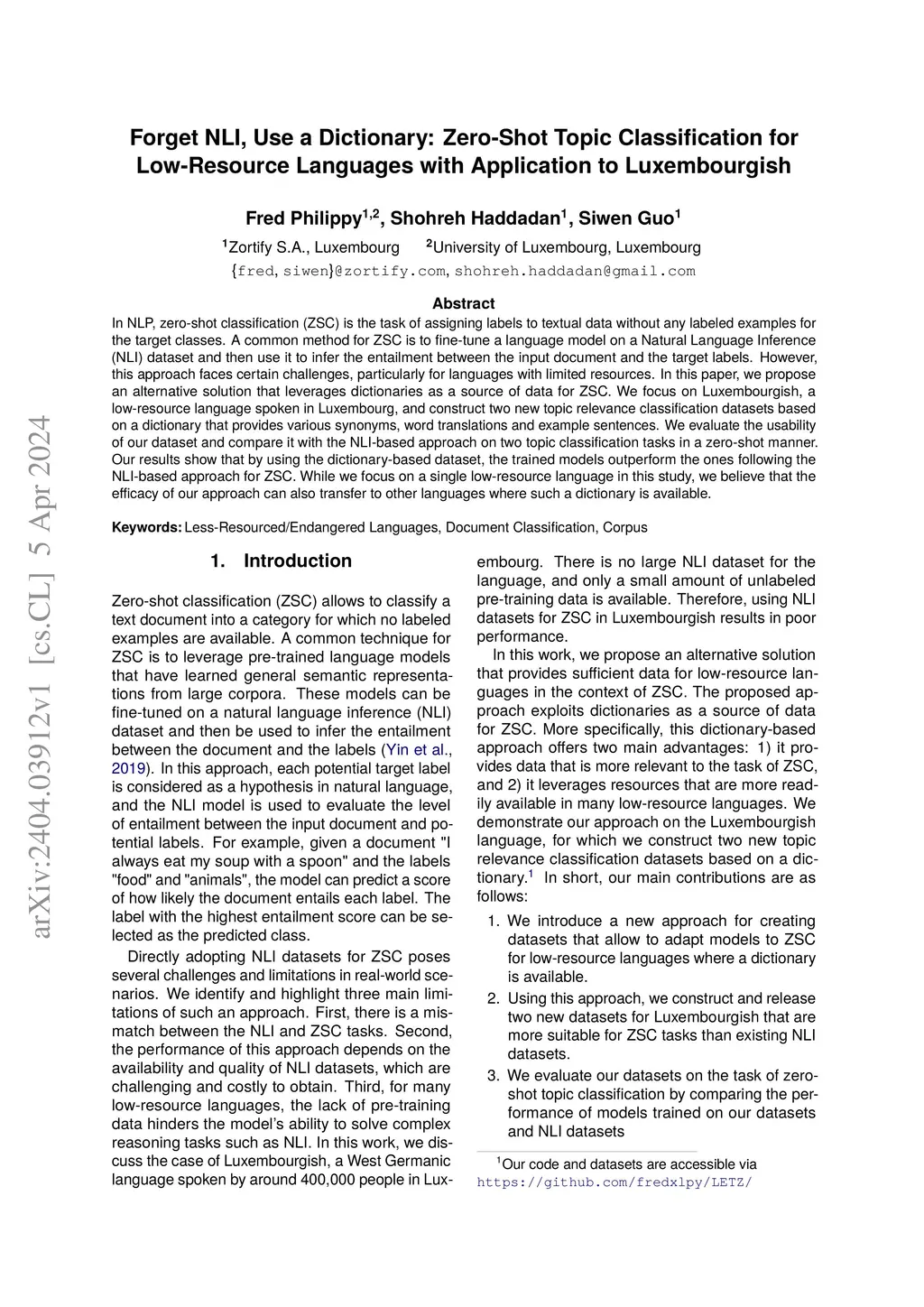 In NLP, zero-shot classification (ZSC) is the task of assigning labels to textual data without any labeled examples for the target classes. A common method for ZSC is to fine-tune a language model on a Natural Language Inference (NLI) dataset and then use it to infer the entailment between the input document and the target labels. However, this approach faces certain challenges, particularly for languages with limited resources. In this paper, we propose an alternative solution that leverages dictionaries as a source of data for ZSC. We focus on Luxembourgish, a low-resource language spoken in Luxembourg, and construct two new topic relevance classification datasets based on a dictionary that provides various synonyms, word translations and example sentences. We evaluate the usability of our dataset and compare it with the NLI-based approach on two topic classification tasks in a zero-shot manner. Our results show that by using the dictionary-based dataset, the trained models outperform the ones following the NLI-based approach for ZSC. While we focus on a single low-resource language in this study, we believe that the efficacy of our approach can also transfer to other languages where such a dictionary is available.