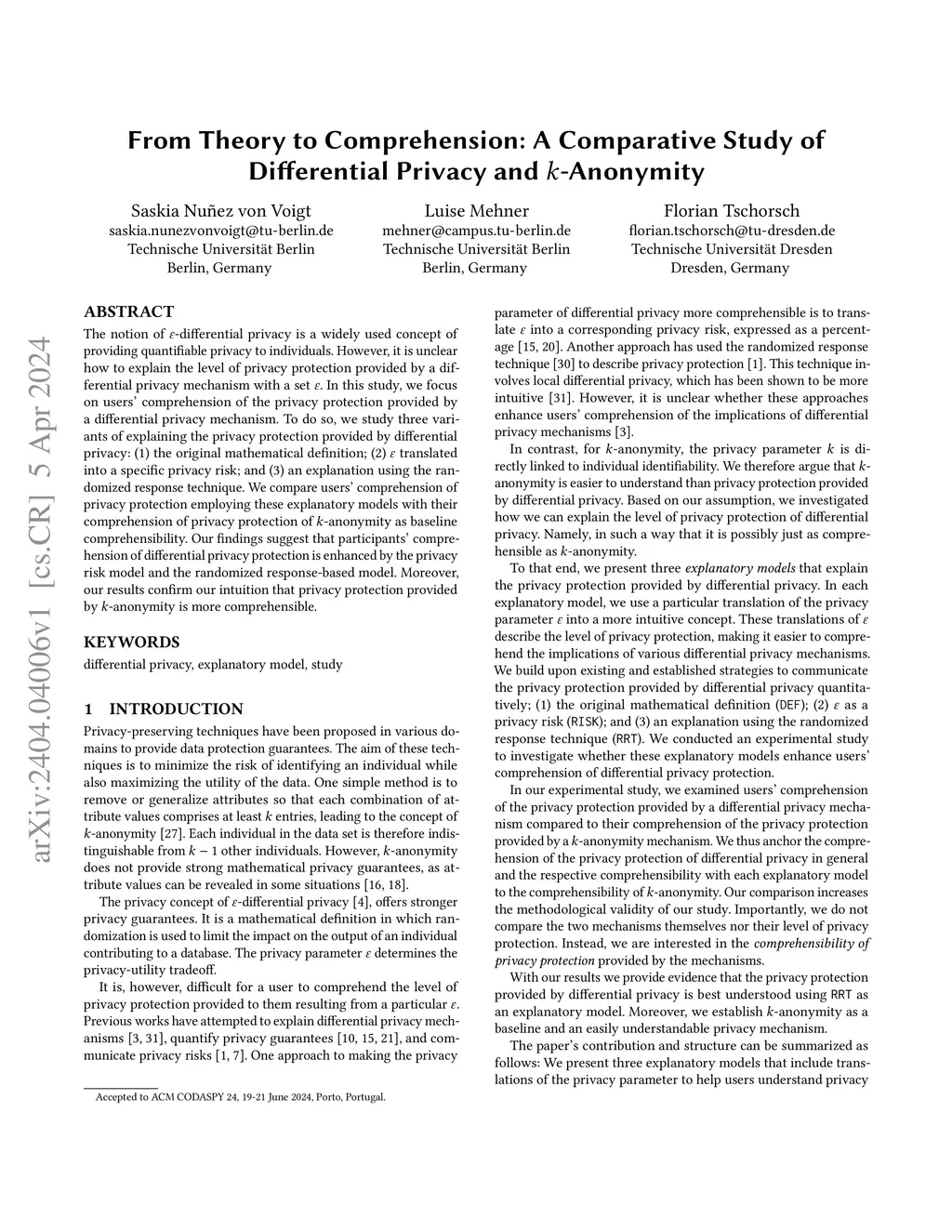 The notion of -differential privacy is a widely used concept of providing quantifiable privacy to individuals. However, it is unclear how to explain the level of privacy protection provided by a differential privacy mechanism with a set . In this study, we focus on users' comprehension of the privacy protection provided by a differential privacy mechanism. To do so, we study three variants of explaining the privacy protection provided by differential privacy: (1) the original mathematical definition; (2) translated into a specific privacy risk; and (3) an explanation using the randomized response technique. We compare users' comprehension of privacy protection employing these explanatory models with their comprehension of privacy protection of -anonymity as baseline comprehensibility. Our findings suggest that participants' comprehension of differential privacy protection is enhanced by the privacy risk model and the randomized response-based model. Moreover, our results confirm our intuition that privacy protection provided by -anonymity is more comprehensible.