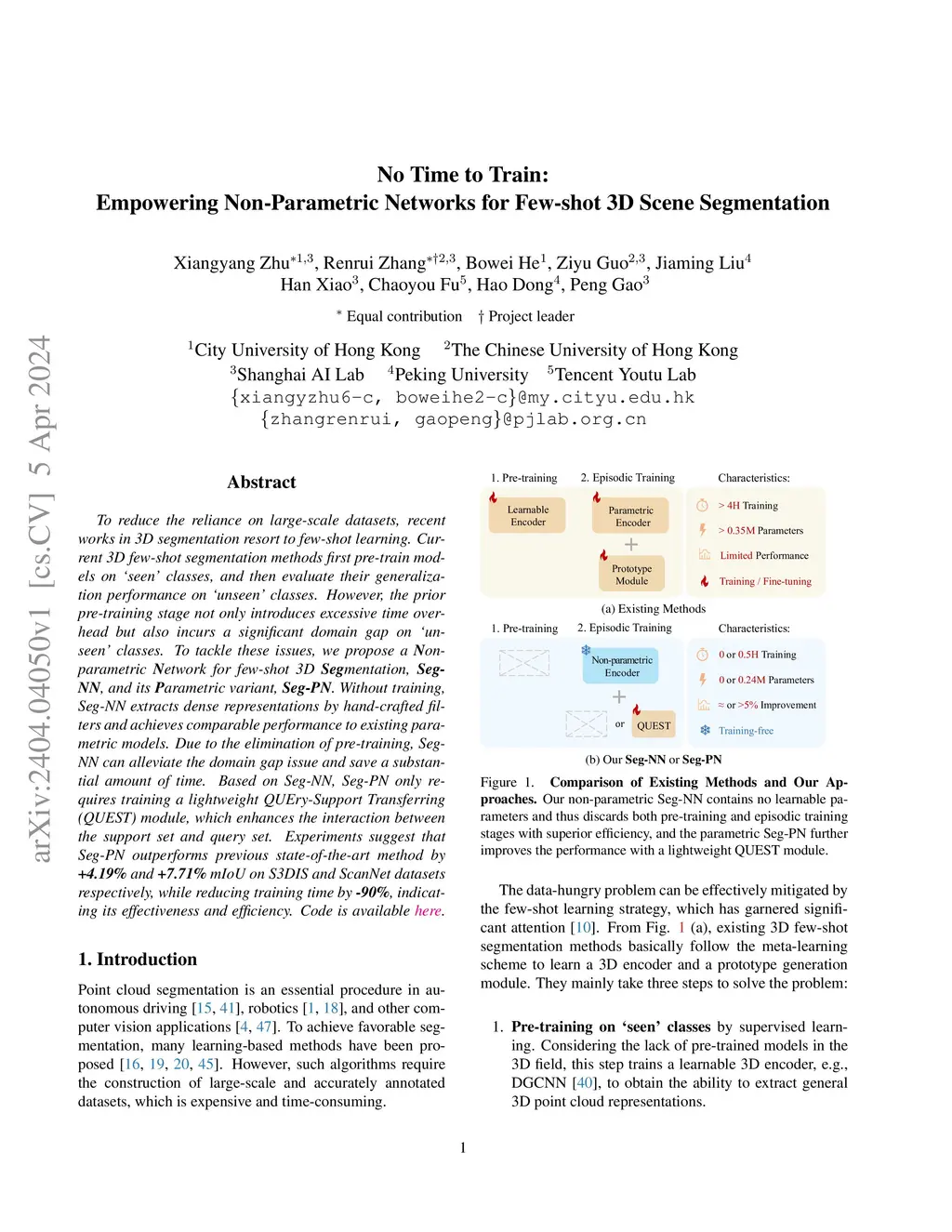 To reduce the reliance on large-scale datasets, recent works in 3D segmentation resort to few-shot learning. Current 3D few-shot segmentation methods first pre-train models on 'seen' classes, and then evaluate their generalization performance on únseen' classes. However, the prior pre-training stage not only introduces excessive time overhead but also incurs a significant domain gap on únseen' classes. To tackle these issues, we propose a Non-parametric Network for few-shot 3D Segmentation, Seg-NN, and its Parametric variant, Seg-PN. Without training, Seg-NN extracts dense representations by hand-crafted filters and achieves comparable performance to existing parametric models. Due to the elimination of pre-training, Seg-NN can alleviate the domain gap issue and save a substantial amount of time. Based on Seg-NN, Seg-PN only requires training a lightweight QUEry-Support Transferring (QUEST) module, which enhances the interaction between the support set and query set. Experiments suggest that Seg-PN outperforms previous state-of-the-art method by +4.19% and +7.71% mIoU on S3DIS and ScanNet datasets respectively, while reducing training time by -90%, indicating its effectiveness and efficiency.