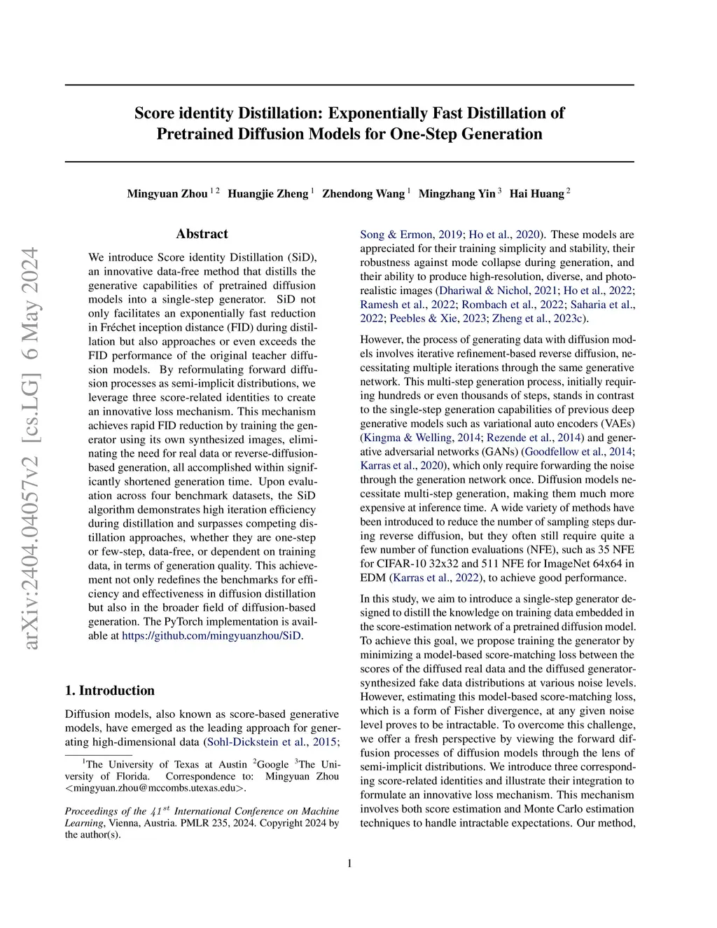 We introduce Score identity Distillation (SiD), an innovative data-free method that distills the generative capabilities of pretrained diffusion models into a single-step generator. SiD not only facilitates an exponentially fast reduction in Fr\échet inception distance (FID) during distillation but also approaches or even exceeds the FID performance of the original teacher diffusion models. By reformulating forward diffusion processes as semi-implicit distributions, we leverage three score-related identities to create an innovative loss mechanism. This mechanism achieves rapid FID reduction by training the generator using its own synthesized images, eliminating the need for real data or reverse-diffusion-based generation, all accomplished within significantly shortened generation time. Upon evaluation across four benchmark datasets, the SiD algorithm demonstrates high iteration efficiency during distillation and surpasses competing distillation approaches, whether they are one-step or few-step, data-free, or dependent on training data, in terms of generation quality. This achievement not only redefines the benchmarks for efficiency and effectiveness in diffusion distillation but also in the broader field of diffusion-based generation. The PyTorch implementation is available at https://github.com/mingyuanzhou/SiD
