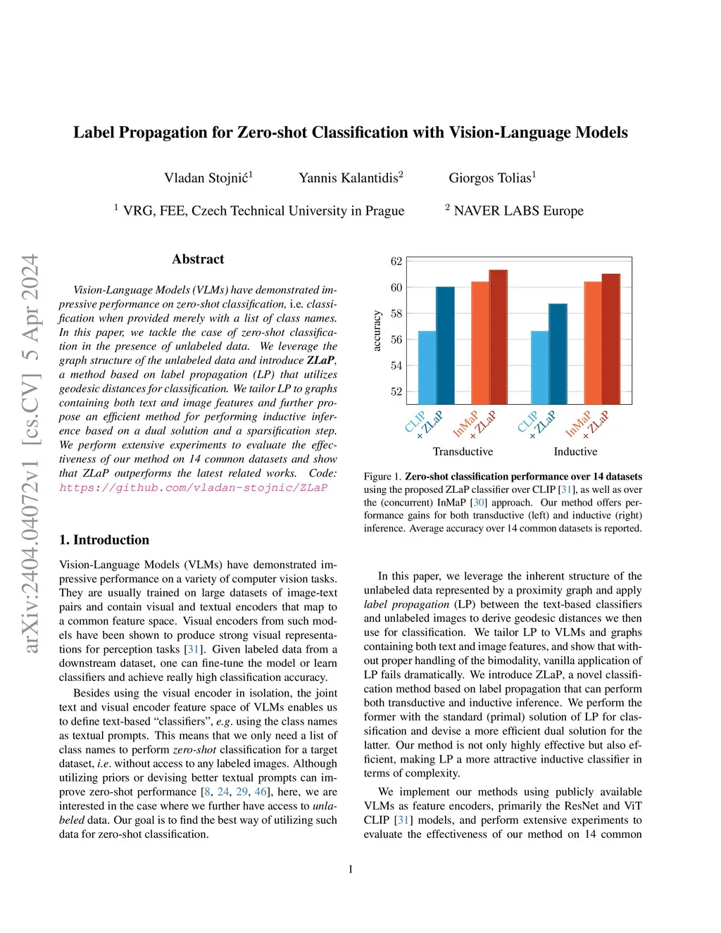 Vision-Language Models (VLMs) have demonstrated impressive performance on zero-shot classification, i.e. classification when provided merely with a list of class names. In this paper, we tackle the case of zero-shot classification in the presence of unlabeled data. We leverage the graph structure of the unlabeled data and introduce ZLaP, a method based on label propagation (LP) that utilizes geodesic distances for classification. We tailor LP to graphs containing both text and image features and further propose an efficient method for performing inductive inference based on a dual solution and a sparsification step. We perform extensive experiments to evaluate the effectiveness of our method on 14 common datasets and show that ZLaP outperforms the latest related works. Code: https://github.com/vladan-stojnic/ZLaP