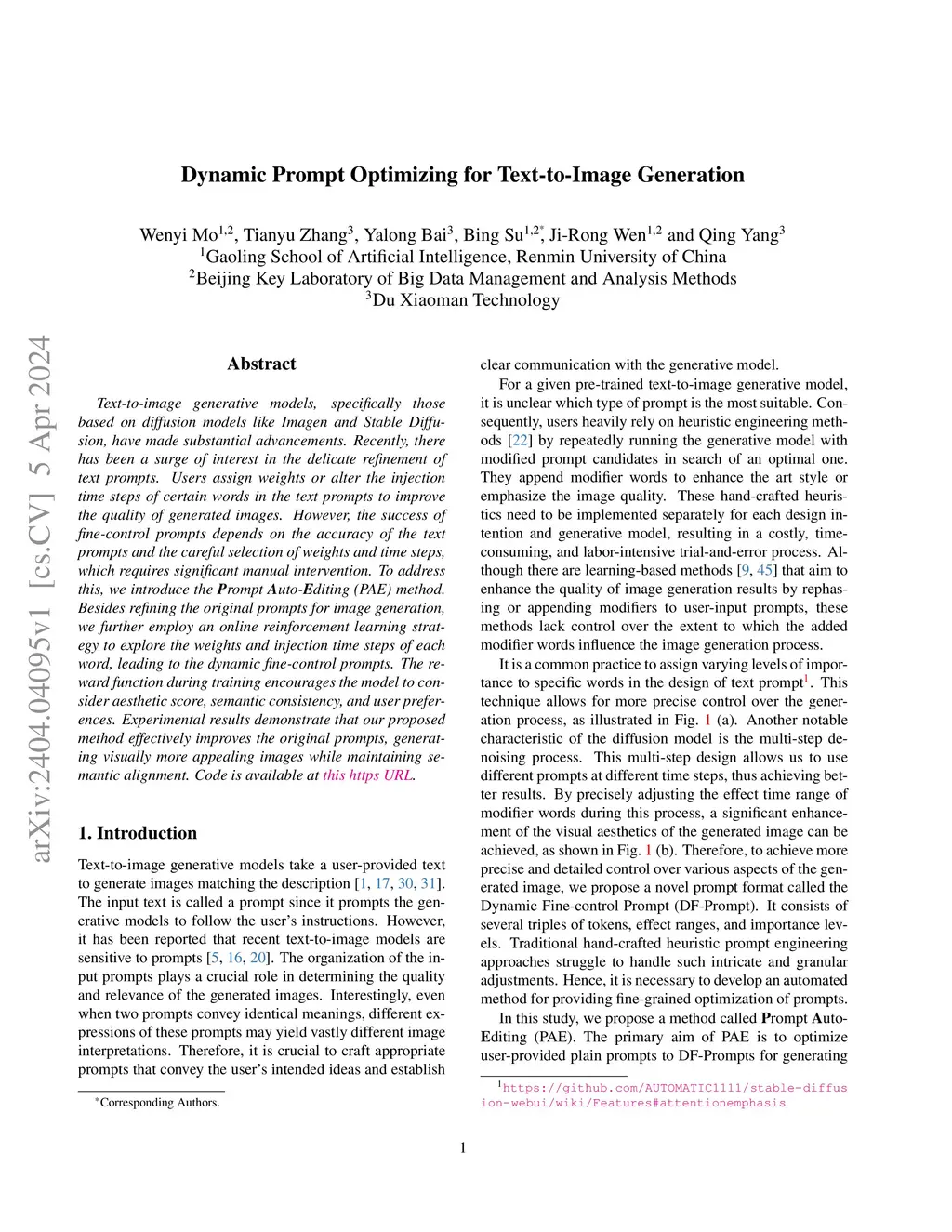 Text-to-image generative models, specifically those based on diffusion models like Imagen and Stable Diffusion, have made substantial advancements. Recently, there has been a surge of interest in the delicate refinement of text prompts. Users assign weights or alter the injection time steps of certain words in the text prompts to improve the quality of generated images. However, the success of fine-control prompts depends on the accuracy of the text prompts and the careful selection of weights and time steps, which requires significant manual intervention. To address this, we introduce the \textbf{P}rompt \textbf{A}uto-\textbf{E}diting (PAE) method. Besides refining the original prompts for image generation, we further employ an online reinforcement learning strategy to explore the weights and injection time steps of each word, leading to the dynamic fine-control prompts. The reward function during training encourages the model to consider aesthetic score, semantic consistency, and user preferences. Experimental results demonstrate that our proposed method effectively improves the original prompts, generating visually more appealing images while maintaining semantic alignment. Code is available at https://github.com/Mowenyii/PAE.