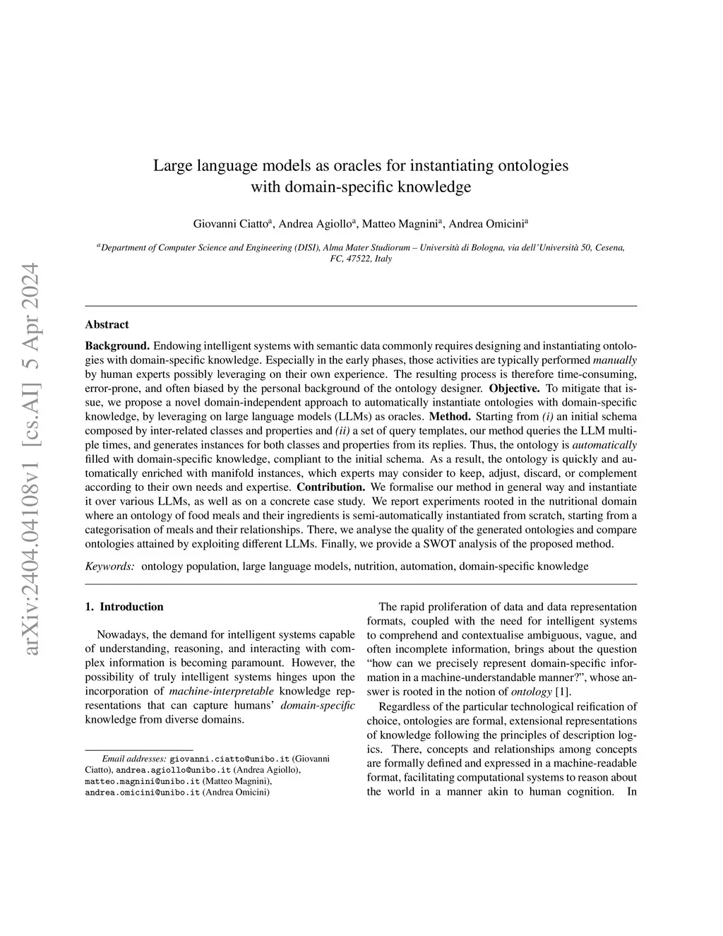 Background. Endowing intelligent systems with semantic data commonly requires designing and instantiating ontologies with domain-specific knowledge. Especially in the early phases, those activities are typically performed manually by human experts possibly leveraging on their own experience. The resulting process is therefore time-consuming, error-prone, and often biased by the personal background of the ontology designer. Objective. To mitigate that issue, we propose a novel domain-independent approach to automatically instantiate ontologies with domain-specific knowledge, by leveraging on large language models (LLMs) as oracles. Method. Starting from (i) an initial schema composed by inter-related classes andproperties and (ii) a set of query templates, our method queries the LLM multi- ple times, and generates instances for both classes and properties from its replies. Thus, the ontology is automatically filled with domain-specific knowledge, compliant to the initial schema. As a result, the ontology is quickly and automatically enriched with manifold instances, which experts may consider to keep, adjust, discard, or complement according to their own needs and expertise. Contribution. We formalise our method in general way and instantiate it over various LLMs, as well as on a concrete case study. We report experiments rooted in the nutritional domain where an ontology of food meals and their ingredients is semi-automatically instantiated from scratch, starting from a categorisation of meals and their relationships. There, we analyse the quality of the generated ontologies and compare ontologies attained by exploiting different LLMs. Finally, we provide a SWOT analysis of the proposed method.