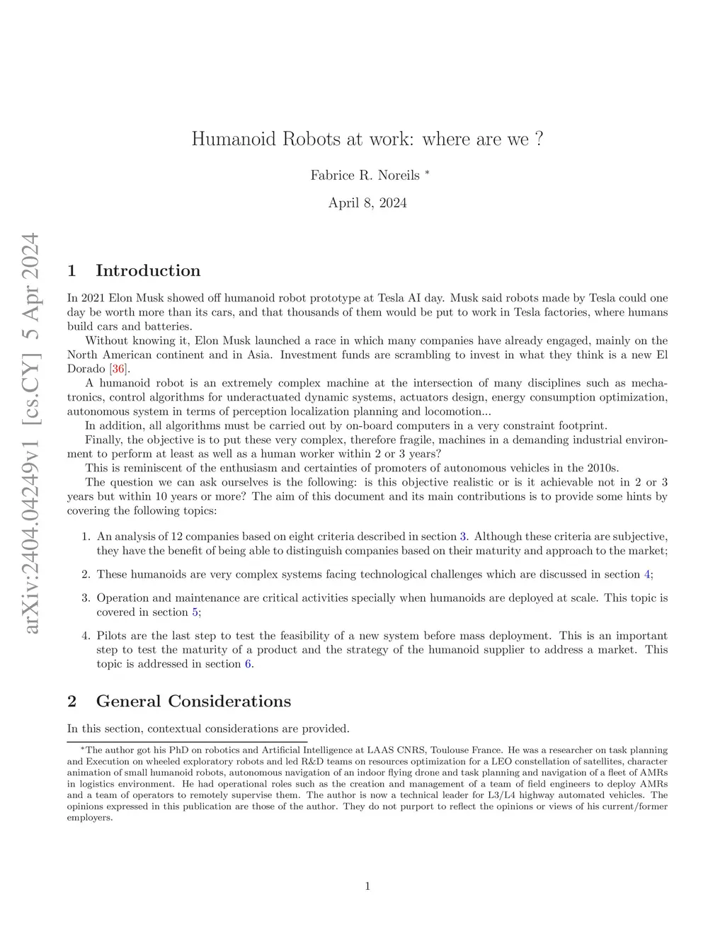 Launched by Elon Musk and its Optimus, we are witnessing a new race in which many companies have already engaged. The objective it to put at work a new generation of humanoid robots in demanding industrial environments within 2 or 3 years. Is this objective realistic ? The aim of this document and its main contributions is to provide some hints by covering the following topics: First an analysis of 12 companies based on eight criteria that will help us to distinguish companies based on their maturity and approach to the market; second as these humanoids are very complex systems we will provide an overview of the technological challenges to be addressed; third when humanoids are deployed at scale, Operation and Maintenance become critical and the we will explore what is new with these complex machines; Finally Pilots are the last step to test the feasibility of a new system before mass deployment. This is an important step to test the maturity of a product and the strategy of the humanoid supplier to address a market and two pragmatic approaches will be discussed.