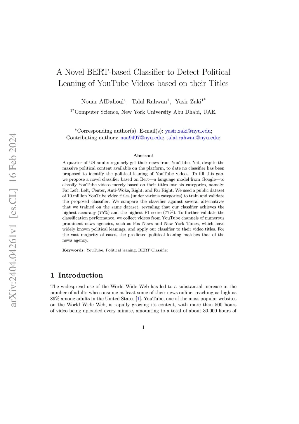 A Novel BERT-based Classifier to Detect Political Leaning of YouTube