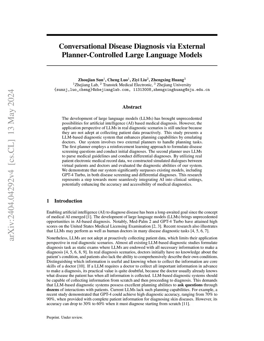 The development of large language models (LLMs) has brought unprecedented possibilities for artificial intelligence (AI) based medical diagnosis. However, the application perspective of LLMs in real diagnostic scenarios is still unclear because they are not adept at collecting patient data proactively. This study presents a LLM-based diagnostic system that enhances planning capabilities by emulating doctors. Our system involves two external planners to handle planning tasks. The first planner employs a reinforcement learning approach to formulate disease screening questions and conduct initial diagnoses. The second planner uses LLMs to parse medical guidelines and conduct differential diagnoses. By utilizing real patient electronic medical record data, we constructed simulated dialogues between virtual patients and doctors and evaluated the diagnostic abilities of our system. We demonstrated that our system obtained impressive performance in both disease screening and differential diagnoses tasks. This research represents a step towards more seamlessly integrating AI into clinical settings, potentially enhancing the accuracy and accessibility of medical diagnostics.