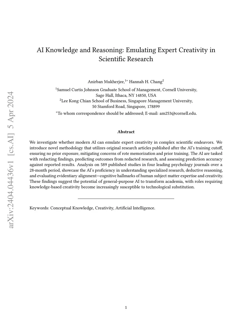 We investigate whether modern AI can emulate expert creativity in complex scientific endeavors. We introduce novel methodology that utilizes original research articles published after the AI's training cutoff, ensuring no prior exposure, mitigating concerns of rote memorization and prior training. The AI are tasked with redacting findings, predicting outcomes from redacted research, and assessing prediction accuracy against reported results. Analysis on 589 published studies in four leading psychology journals over a 28-month period, showcase the AI's proficiency in understanding specialized research, deductive reasoning, and evaluating evidentiary alignment--cognitive hallmarks of human subject matter expertise and creativity. These findings suggest the potential of general-purpose AI to transform academia, with roles requiring knowledge-based creativity become increasingly susceptible to technological substitution.