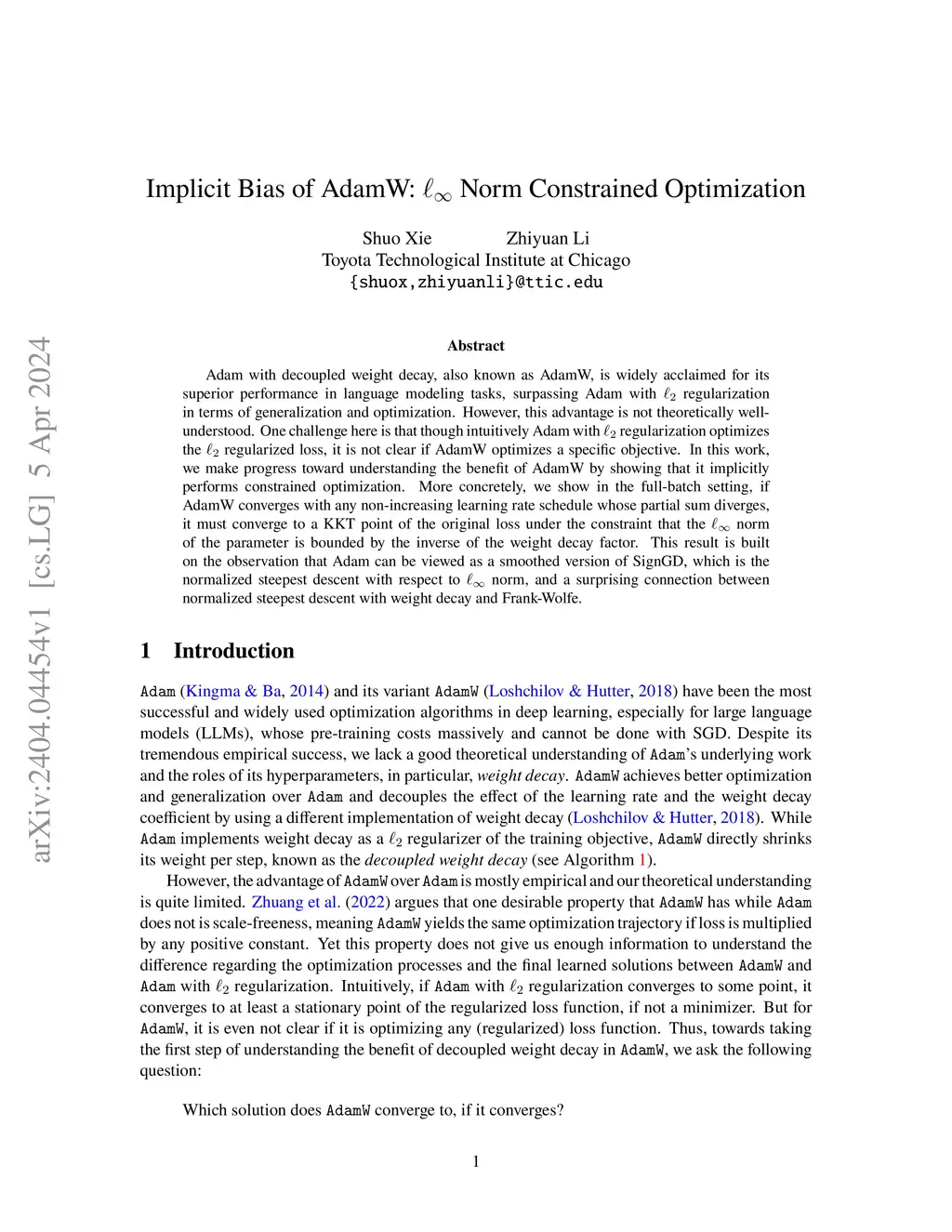 Adam with decoupled weight decay, also known as AdamW, is widely acclaimed for its superior performance in language modeling tasks, surpassing Adam with regularization in terms of generalization and optimization. However, this advantage is not theoretically well-understood. One challenge here is that though intuitively Adam with regularization optimizes the regularized loss, it is not clear if AdamW optimizes a specific objective. In this work, we make progress toward understanding the benefit of AdamW by showing that it implicitly performs constrained optimization. More concretely, we show in the full-batch setting, if AdamW converges with any non-increasing learning rate schedule whose partial sum diverges, it must converge to a KKT point of the original loss under the constraint that the norm of the parameter is bounded by the inverse of the weight decay factor. This result is built on the observation that Adam can be viewed as a smoothed version of SignGD, which is the normalized steepest descent with respect to norm, and a surprising connection between normalized steepest descent with weight decay and Frank-Wolfe.
