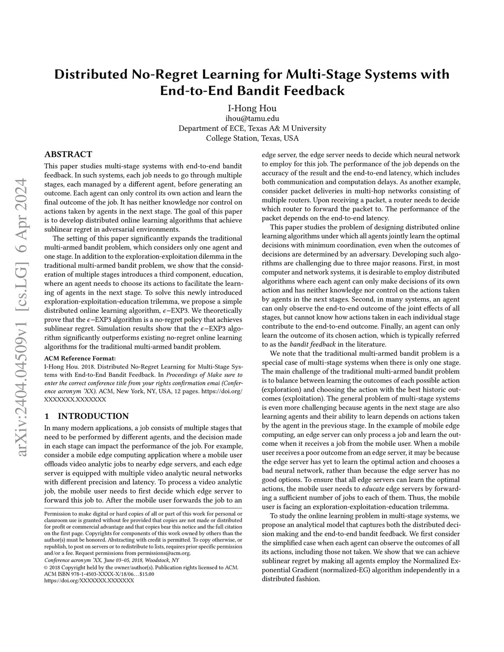 This paper studies multi-stage systems with end-to-end bandit feedback. In such systems, each job needs to go through multiple stages, each managed by a different agent, before generating an outcome. Each agent can only control its own action and learn the final outcome of the job. It has neither knowledge nor control on actions taken by agents in the next stage. The goal of this paper is to develop distributed online learning algorithms that achieve sublinear regret in adversarial environments. The setting of this paper significantly expands the traditional multi-armed bandit problem, which considers only one agent and one stage. In addition to the exploration-exploitation dilemma in the traditional multi-armed bandit problem, we show that the consideration of multiple stages introduces a third component, education, where an agent needs to choose its actions to facilitate the learning of agents in the next stage. To solve this newly introduced exploration-exploitation-education trilemma, we propose a simple distributed online learning algorithm, EXP3. We theoretically prove that the EXP3 algorithm is a no-regret policy that achieves sublinear regret. Simulation results show that the EXP3 algorithm significantly outperforms existing no-regret online learning algorithms for the traditional multi-armed bandit problem.