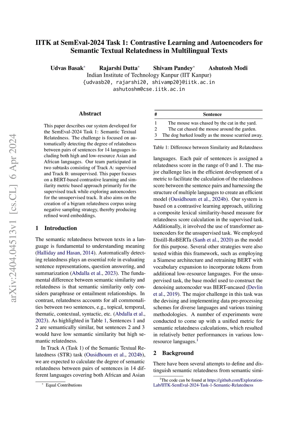 IITK at SemEval-2024 Task 1: Contrastive Learning and Autoencoders for