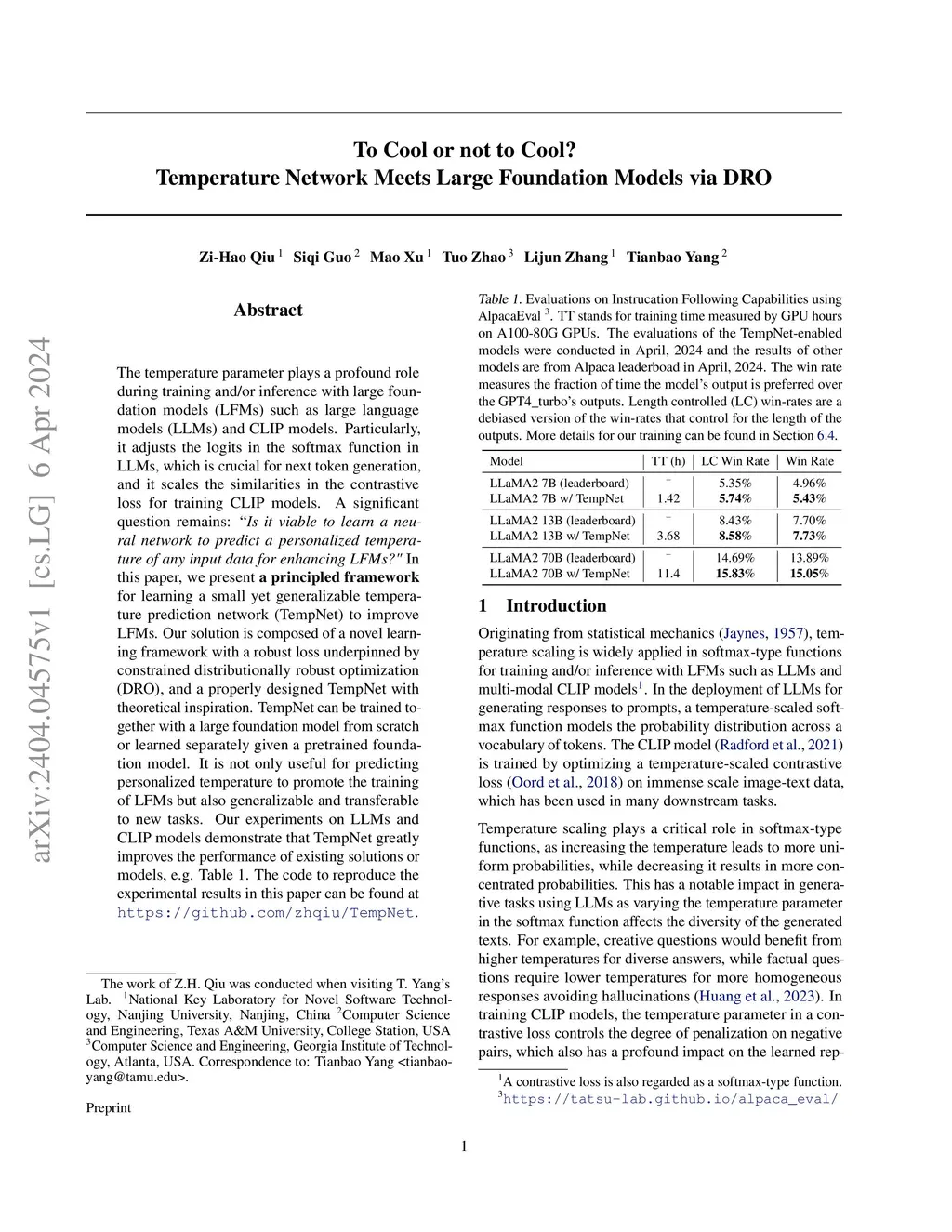 The temperature parameter plays a profound role during training and/or inference with large foundation models (LFMs) such as large language models (LLMs) and CLIP models. Particularly, it adjusts the logits in the softmax function in LLMs, which is crucial for next token generation, and it scales the similarities in the contrastive loss for training CLIP models. A significant question remains: Is it viable to learn a neural network to predict a personalized temperature of any input data for enhancing LFMs"? In this paper, we present a principled framework for learning a small yet generalizable temperature prediction network (TempNet) to improve LFMs. Our solution is composed of a novel learning framework with a robust loss underpinned by constrained distributionally robust optimization (DRO), and a properly designed TempNet with theoretical inspiration. TempNet can be trained together with a large foundation model from scratch or learned separately given a pretrained foundation model. It is not only useful for predicting personalized temperature to promote the training of LFMs but also generalizable and transferable to new tasks. Our experiments on LLMs and CLIP models demonstrate that TempNet greatly improves the performance of existing solutions or models, e.g. Table 1. The code to reproduce the experimental results in this paper can be found at https://github.com/zhqiu/TempNet.