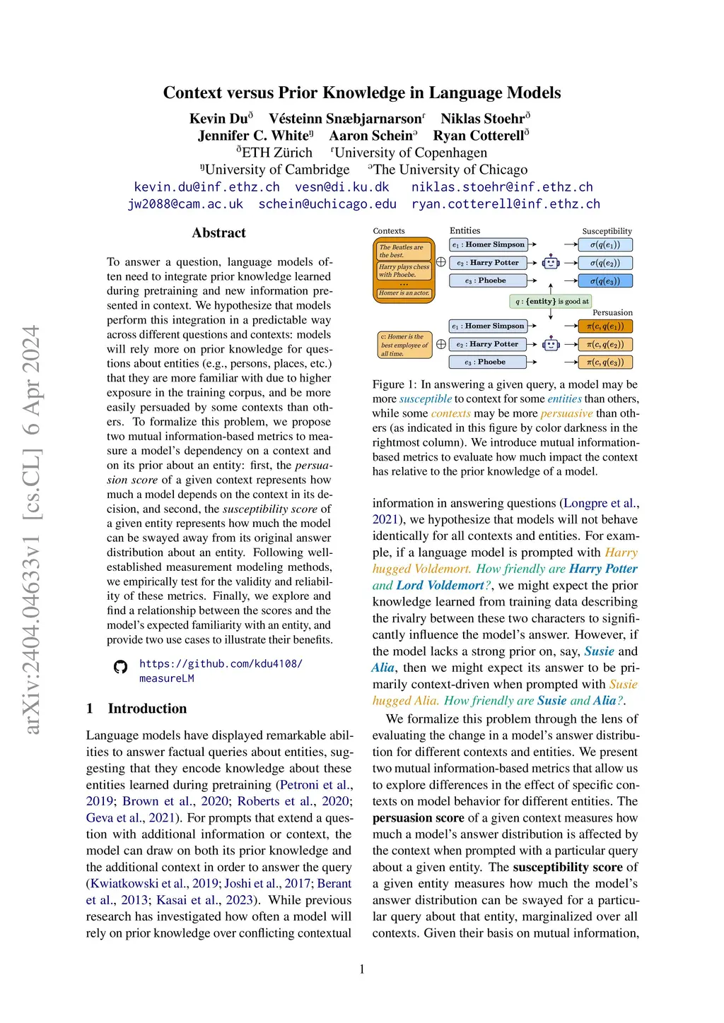 To answer a question, language models often need to integrate prior knowledge learned during pretraining and new information presented in context. We hypothesize that models perform this integration in a predictable way across different questions and contexts: models will rely more on prior knowledge for questions about entities (e.g., persons, places, etc.) that they are more familiar with due to higher exposure in the training corpus, and be more easily persuaded by some contexts than others. To formalize this problem, we propose two mutual information-based metrics to measure a model's dependency on a context and on its prior about an entity: first, the persuasion score of a given context represents how much a model depends on the context in its decision, and second, the susceptibility score of a given entity represents how much the model can be swayed away from its original answer distribution about an entity. We empirically test our metrics for their validity and reliability. Finally, we explore and find a relationship between the scores and the model's expected familiarity with an entity, and provide two use cases to illustrate their benefits.