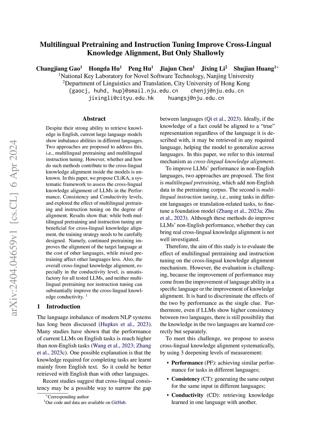 Despite their strong ability to retrieve knowledge in English, current large language models show imbalance abilities in different languages. Two approaches are proposed to address this, i.e., multilingual pretraining and multilingual instruction tuning. However, whether and how do such methods contribute to the cross-lingual knowledge alignment inside the models is unknown. In this paper, we propose CLiKA, a systematic framework to assess the cross-lingual knowledge alignment of LLMs in the Performance, Consistency and Conductivity levels, and explored the effect of multilingual pretraining and instruction tuning on the degree of alignment. Results show that: while both multilingual pretraining and instruction tuning are beneficial for cross-lingual knowledge alignment, the training strategy needs to be carefully designed. Namely, continued pretraining improves the alignment of the target language at the cost of other languages, while mixed pretraining affect other languages less. Also, the overall cross-lingual knowledge alignment, especially in the conductivity level, is unsatisfactory for all tested LLMs, and neither multilingual pretraining nor instruction tuning can substantially improve the cross-lingual knowledge conductivity.