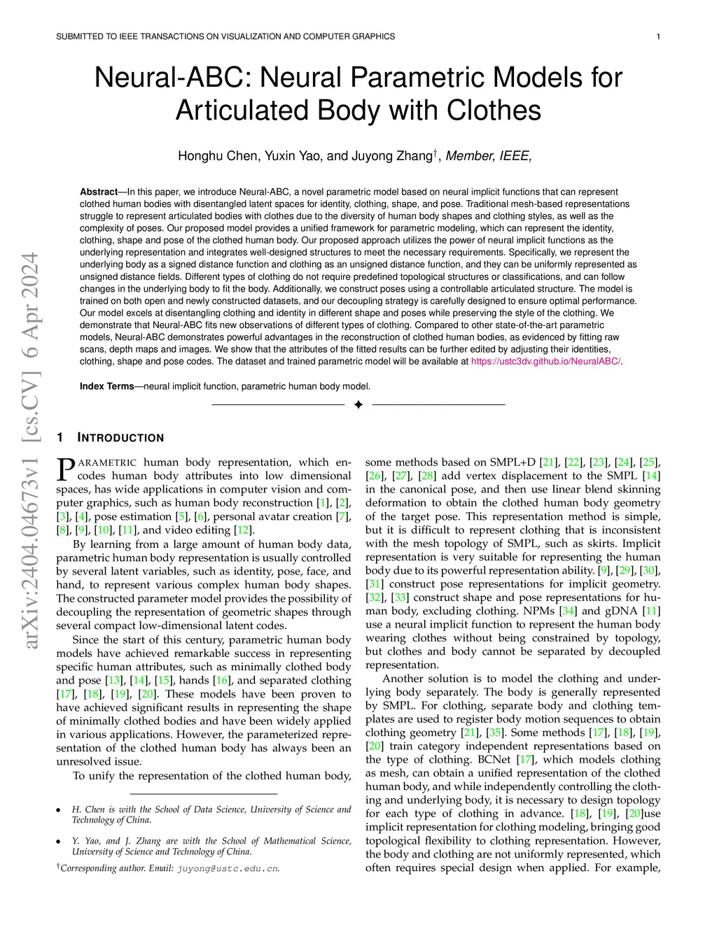 In this paper, we introduce Neural-ABC, a novel parametric model based on neural implicit functions that can represent clothed human bodies with disentangled latent spaces for identity, clothing, shape, and pose. Traditional mesh-based representations struggle to represent articulated bodies with clothes due to the diversity of human body shapes and clothing styles, as well as the complexity of poses. Our proposed model provides a unified framework for parametric modeling, which can represent the identity, clothing, shape and pose of the clothed human body. Our proposed approach utilizes the power of neural implicit functions as the underlying representation and integrates well-designed structures to meet the necessary requirements. Specifically, we represent the underlying body as a signed distance function and clothing as an unsigned distance function, and they can be uniformly represented as unsigned distance fields. Different types of clothing do not require predefined topological structures or classifications, and can follow changes in the underlying body to fit the body. Additionally, we construct poses using a controllable articulated structure. The model is trained on both open and newly constructed datasets, and our decoupling strategy is carefully designed to ensure optimal performance. Our model excels at disentangling clothing and identity in different shape and poses while preserving the style of the clothing. We demonstrate that Neural-ABC fits new observations of different types of clothing. Compared to other state-of-the-art parametric models, Neural-ABC demonstrates powerful advantages in the reconstruction of clothed human bodies, as evidenced by fitting raw scans, depth maps and images. We show that the attributes of the fitted results can be further edited by adjusting their identities, clothing, shape and pose codes.