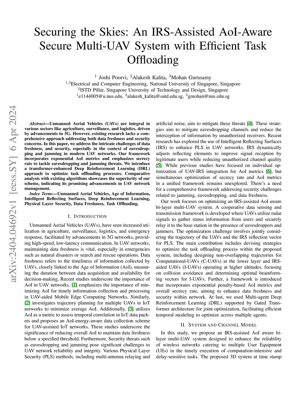 Unmanned Aerial Vehicles (UAVs) are integral in various sectors like agriculture, surveillance, and logistics, driven by advancements in 5G. However, existing research lacks a comprehensive approach addressing both data freshness and security concerns. In this paper, we address the intricate challenges of data freshness, and security, especially in the context of eavesdropping and jamming in modern UAV networks. Our framework incorporates exponential AoI metrics and emphasizes secrecy rate to tackle eavesdropping and jamming threats. We introduce a transformer-enhanced Deep Reinforcement Learning (DRL) approach to optimize task offloading processes. Comparative analysis with existing algorithms showcases the superiority of our scheme, indicating its promising advancements in UAV network management.