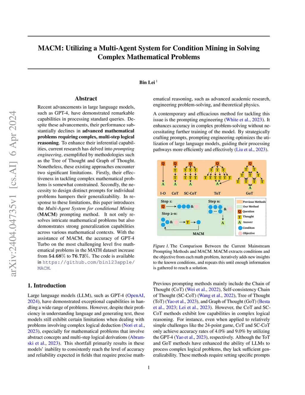 Recent advancements in large language models, such as GPT-4, have demonstrated remarkable capabilities in processing standard queries. Despite these advancements, their performance substantially declines in \textbf{advanced mathematical problems requiring complex, multi-step logical reasoning}. To enhance their inferential capabilities, current research has delved into \textit{prompting engineering}, exemplified by methodologies such as the Tree of Thought and Graph of Thought. Nonetheless, these existing approaches encounter two significant limitations. Firstly, their effectiveness in tackling complex mathematical problems is somewhat constrained. Secondly, the necessity to design distinct prompts for individual problems hampers their generalizability. In response to these limitations, this paper introduces the \textit{Multi-Agent System for conditional Mining} (\textbf{MACM}) prompting method. It not only resolves intricate mathematical problems but also demonstrates strong generalization capabilities across various mathematical contexts. With the assistance of MACM, the accuracy of GPT-4 Turbo on the most challenging level five mathematical problems in the MATH dataset increase from . The code is available in \url{https://github.com/bin123apple/MACM}.