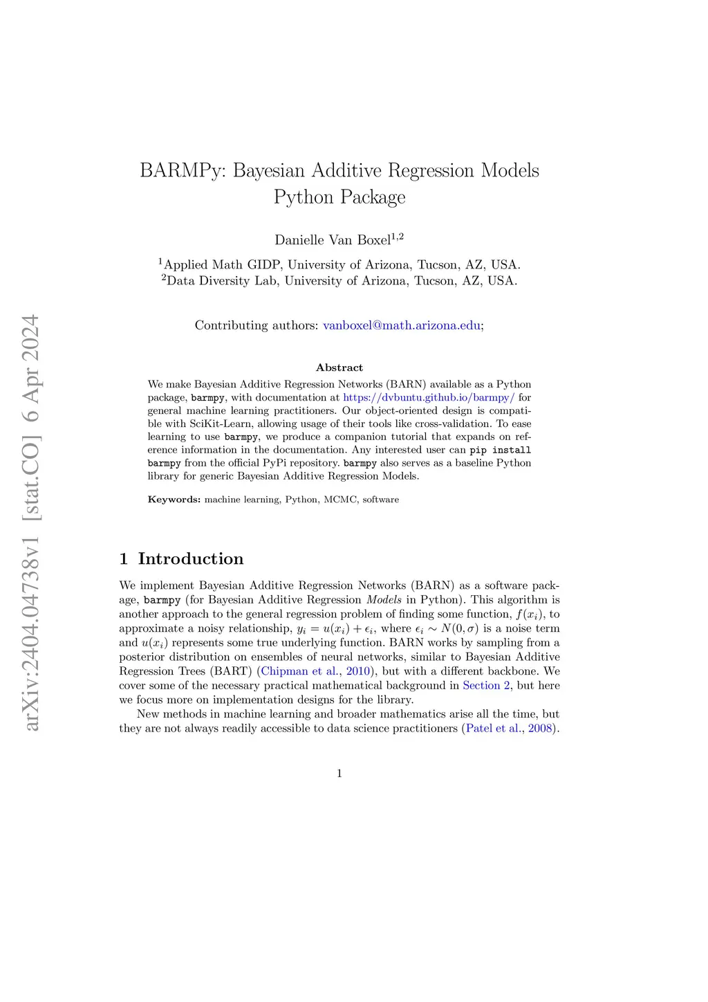 We make Bayesian Additive Regression Networks (BARN) available as a Python package, \texttt{barmpy}, with documentation at \url{https://dvbuntu.github.io/barmpy/} for general machine learning practitioners. Our object-oriented design is compatible with SciKit-Learn, allowing usage of their tools like cross-validation. To ease learning to use \texttt{barmpy}, we produce a companion tutorial that expands on reference information in the documentation. Any interested user can \texttt{pip install barmpy} from the official PyPi repository. \texttt{barmpy} also serves as a baseline Python library for generic Bayesian Additive Regression Models.