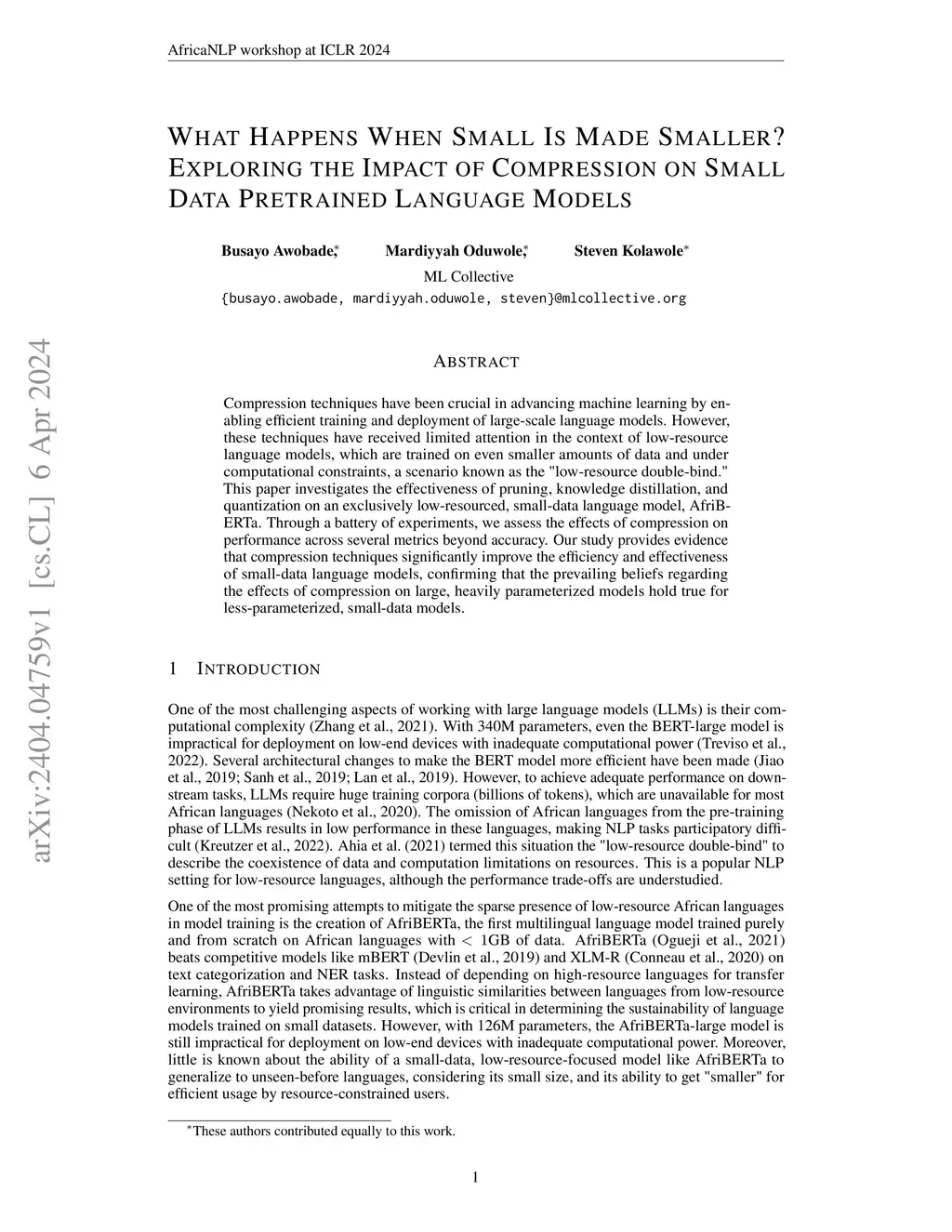 Compression techniques have been crucial in advancing machine learning by enabling efficient training and deployment of large-scale language models. However, these techniques have received limited attention in the context of low-resource language models, which are trained on even smaller amounts of data and under computational constraints, a scenario known as the "low-resource double-bind." This paper investigates the effectiveness of pruning, knowledge distillation, and quantization on an exclusively low-resourced, small-data language model, AfriBERTa. Through a battery of experiments, we assess the effects of compression on performance across several metrics beyond accuracy. Our study provides evidence that compression techniques significantly improve the efficiency and effectiveness of small-data language models, confirming that the prevailing beliefs regarding the effects of compression on large, heavily parameterized models hold true for less-parameterized, small-data models.