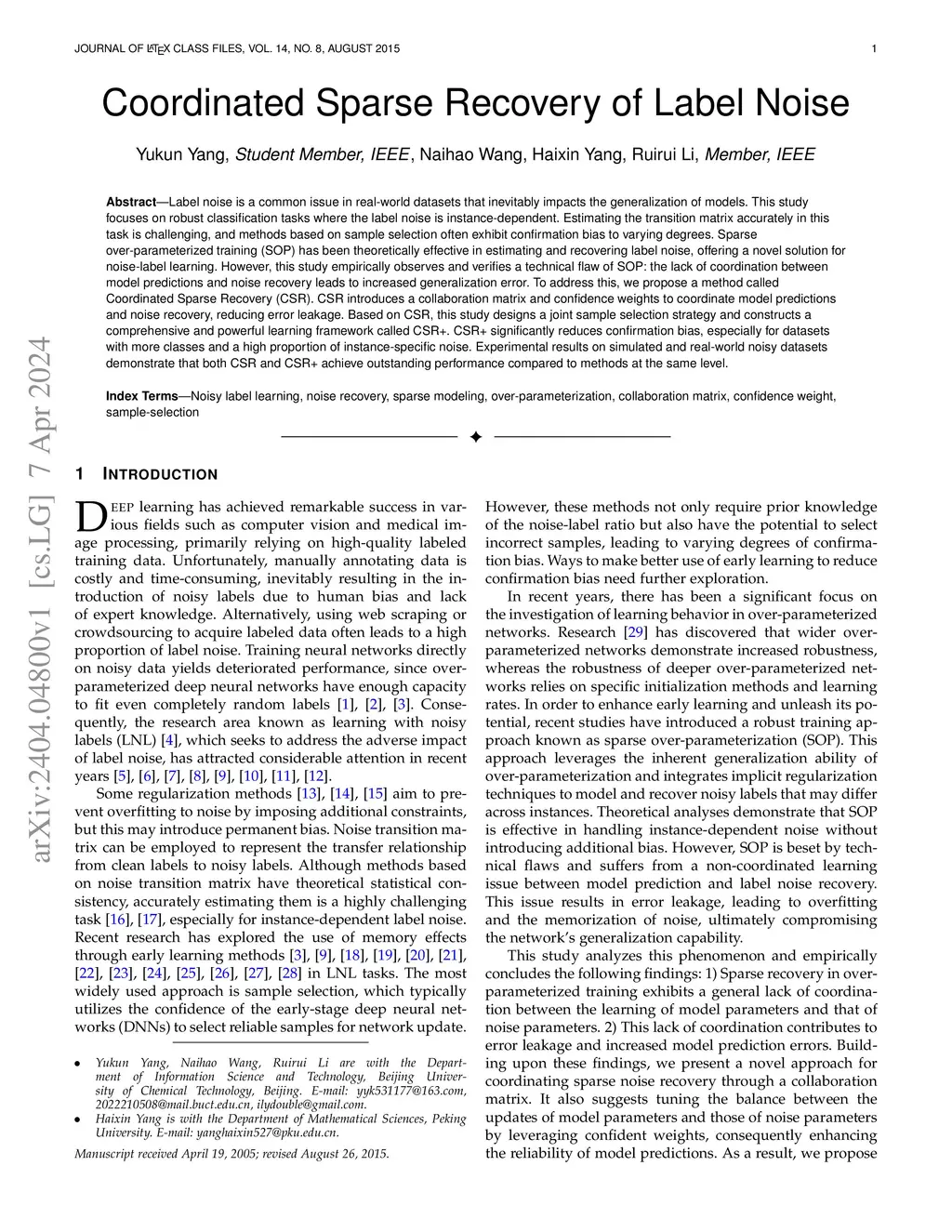 Label noise is a common issue in real-world datasets that inevitably impacts the generalization of models. This study focuses on robust classification tasks where the label noise is instance-dependent. Estimating the transition matrix accurately in this task is challenging, and methods based on sample selection often exhibit confirmation bias to varying degrees. Sparse over-parameterized training (SOP) has been theoretically effective in estimating and recovering label noise, offering a novel solution for noise-label learning. However, this study empirically observes and verifies a technical flaw of SOP: the lack of coordination between model predictions and noise recovery leads to increased generalization error. To address this, we propose a method called Coordinated Sparse Recovery (CSR). CSR introduces a collaboration matrix and confidence weights to coordinate model predictions and noise recovery, reducing error leakage. Based on CSR, this study designs a joint sample selection strategy and constructs a comprehensive and powerful learning framework called CSR+. CSR+ significantly reduces confirmation bias, especially for datasets with more classes and a high proportion of instance-specific noise. Experimental results on simulated and real-world noisy datasets demonstrate that both CSR and CSR+ achieve outstanding performance compared to methods at the same level.