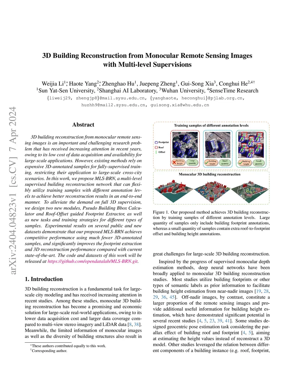 3D building reconstruction from monocular remote sensing images is an important and challenging research problem that has received increasing attention in recent years, owing to its low cost of data acquisition and availability for large-scale applications. However, existing methods rely on expensive 3D-annotated samples for fully-supervised training, restricting their application to large-scale cross-city scenarios. In this work, we propose MLS-BRN, a multi-level supervised building reconstruction network that can flexibly utilize training samples with different annotation levels to achieve better reconstruction results in an end-to-end manner. To alleviate the demand on full 3D supervision, we design two new modules, Pseudo Building Bbox Calculator and Roof-Offset guided Footprint Extractor, as well as new tasks and training strategies for different types of samples. Experimental results on several public and new datasets demonstrate that our proposed MLS-BRN achieves competitive performance using much fewer 3D-annotated samples, and significantly improves the footprint extraction and 3D reconstruction performance compared with current state-of-the-art. The code and datasets of this work will be released at https://github.com/opendatalab/MLS-BRN.git.
