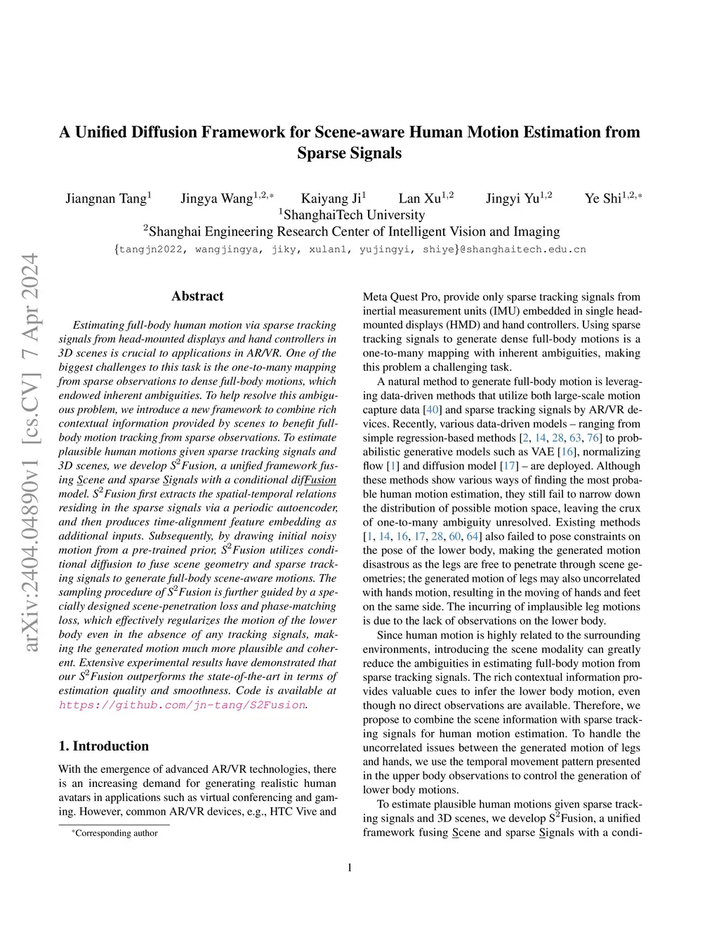 Estimating full-body human motion via sparse tracking signals from head-mounted displays and hand controllers in 3D scenes is crucial to applications in AR/VR. One of the biggest challenges to this task is the one-to-many mapping from sparse observations to dense full-body motions, which endowed inherent ambiguities. To help resolve this ambiguous problem, we introduce a new framework to combine rich contextual information provided by scenes to benefit full-body motion tracking from sparse observations. To estimate plausible human motions given sparse tracking signals and 3D scenes, we develop Fusion, a unified framework fusing \underline{S}cene and sparse \underline{S}ignals with a conditional dif\underline{Fusion} model. Fusion first extracts the spatial-temporal relations residing in the sparse signals via a periodic autoencoder, and then produces time-alignment feature embedding as additional inputs. Subsequently, by drawing initial noisy motion from a pre-trained prior, Fusion utilizes conditional diffusion to fuse scene geometry and sparse tracking signals to generate full-body scene-aware motions. The sampling procedure of Fusion is further guided by a specially designed scene-penetration loss and phase-matching loss, which effectively regularizes the motion of the lower body even in the absence of any tracking signals, making the generated motion much more plausible and coherent. Extensive experimental results have demonstrated that our Fusion outperforms the state-of-the-art in terms of estimation quality and smoothness.