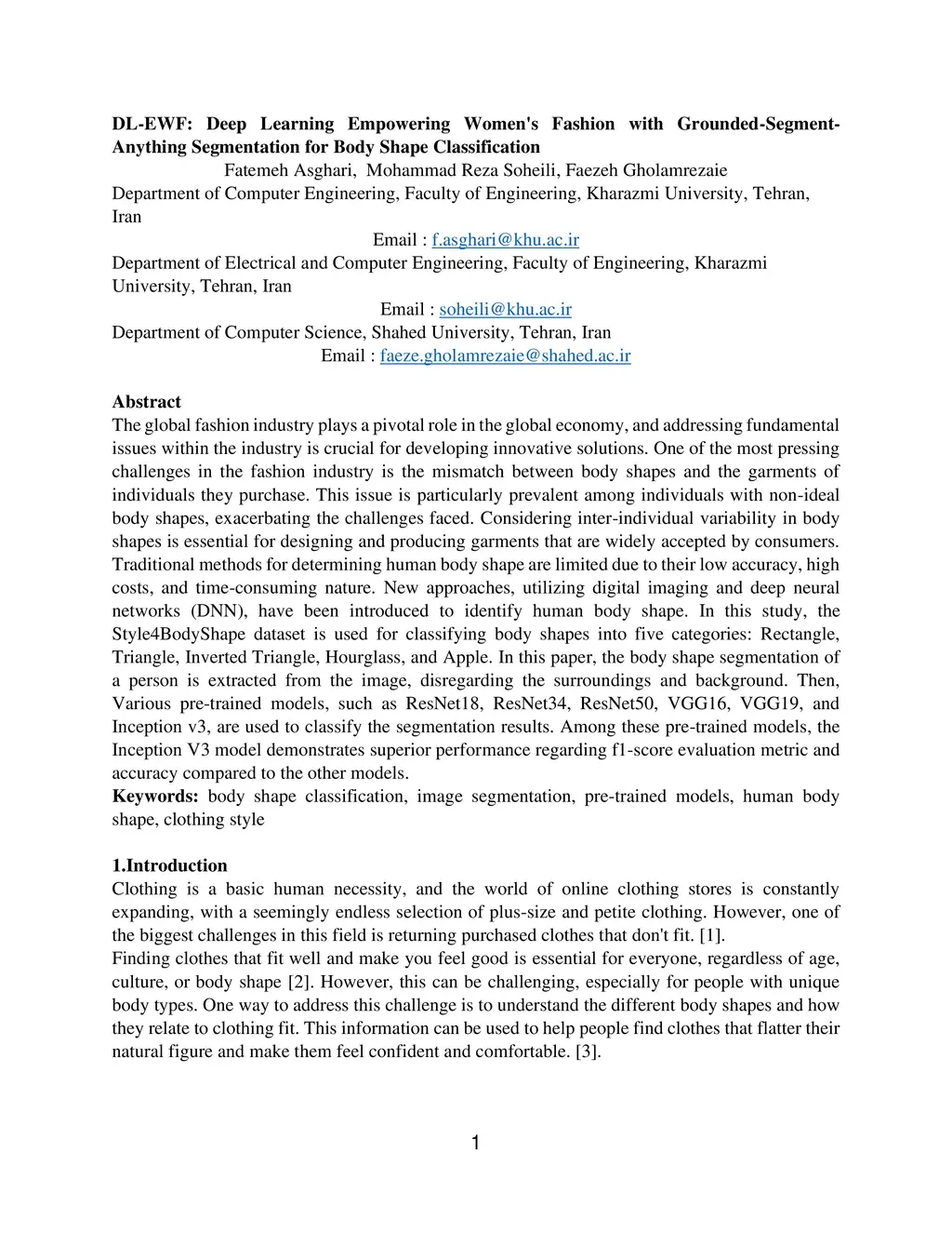The global fashion industry plays a pivotal role in the global economy, and addressing fundamental issues within the industry is crucial for developing innovative solutions. One of the most pressing challenges in the fashion industry is the mismatch between body shapes and the garments of individuals they purchase. This issue is particularly prevalent among individuals with non-ideal body shapes, exacerbating the challenges faced. Considering inter-individual variability in body shapes is essential for designing and producing garments that are widely accepted by consumers. Traditional methods for determining human body shape are limited due to their low accuracy, high costs, and time-consuming nature. New approaches, utilizing digital imaging and deep neural networks (DNN), have been introduced to identify human body shape. In this study, the Style4BodyShape dataset is used for classifying body shapes into five categories: Rectangle, Triangle, Inverted Triangle, Hourglass, and Apple. In this paper, the body shape segmentation of a person is extracted from the image, disregarding the surroundings and background. Then, Various pre-trained models, such as ResNet18, ResNet34, ResNet50, VGG16, VGG19, and Inception v3, are used to classify the segmentation results. Among these pre-trained models, the Inception V3 model demonstrates superior performance regarding f1-score evaluation metric and accuracy compared to the other models.