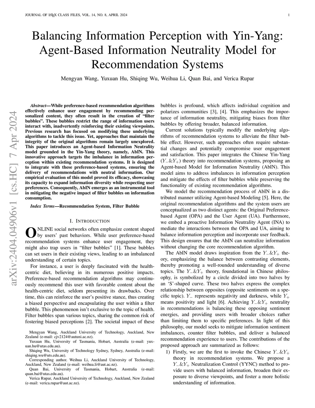 While preference-based recommendation algorithms effectively enhance user engagement by recommending personalized content, they often result in the creation of ``filter bubbles''. These bubbles restrict the range of information users interact with, inadvertently reinforcing their existing viewpoints. Previous research has focused on modifying these underlying algorithms to tackle this issue. Yet, approaches that maintain the integrity of the original algorithms remain largely unexplored. This paper introduces an Agent-based Information Neutrality model grounded in the Yin-Yang theory, namely, AbIN. This innovative approach targets the imbalance in information perception within existing recommendation systems. It is designed to integrate with these preference-based systems, ensuring the delivery of recommendations with neutral information. Our empirical evaluation of this model proved its efficacy, showcasing its capacity to expand information diversity while respecting user preferences. Consequently, AbIN emerges as an instrumental tool in mitigating the negative impact of filter bubbles on information consumption.