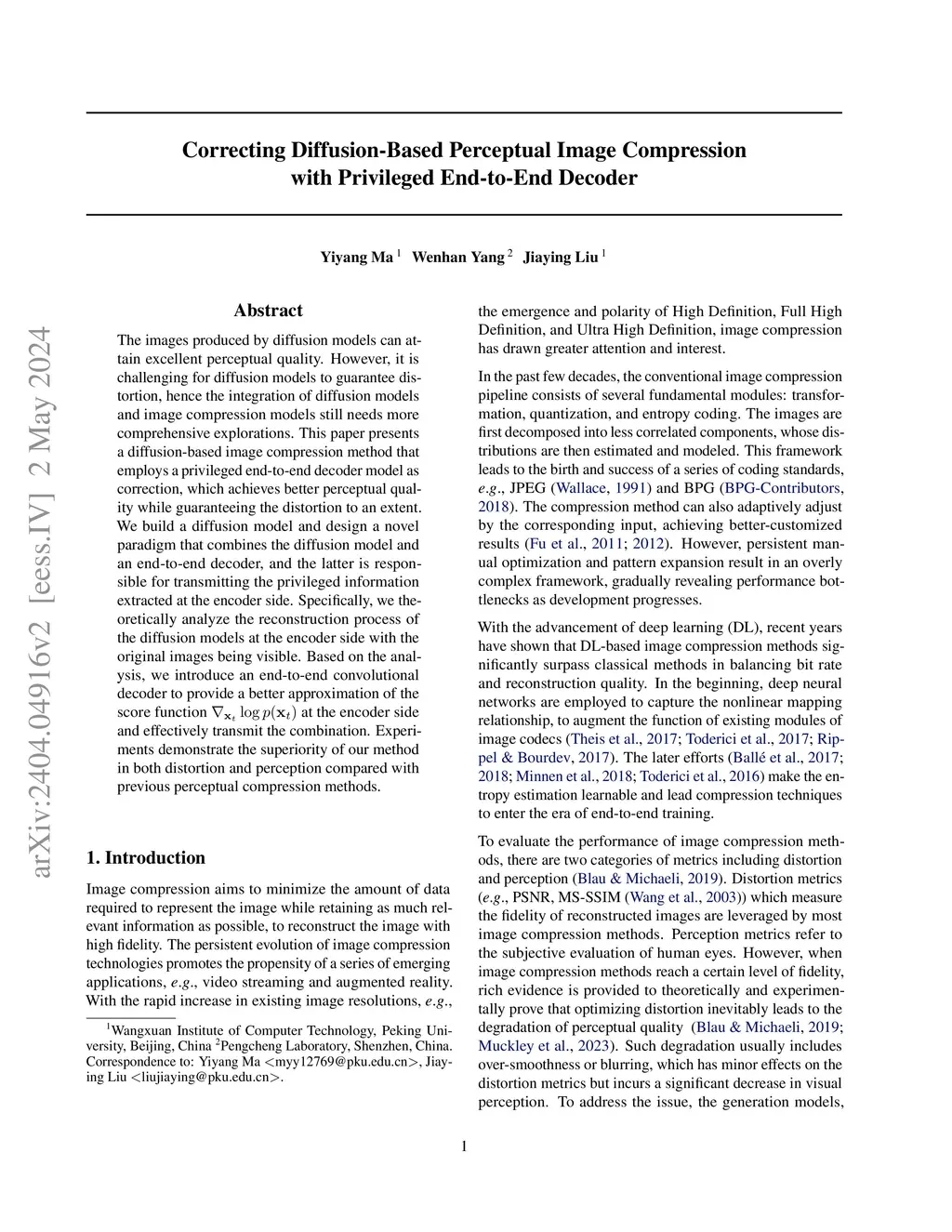 The images produced by diffusion models can attain excellent perceptual quality. However, it is challenging for diffusion models to guarantee distortion, hence the integration of diffusion models and image compression models still needs more comprehensive explorations. This paper presents a diffusion-based image compression method that employs a privileged end-to-end decoder model as correction, which achieves better perceptual quality while guaranteeing the distortion to an extent. We build a diffusion model and design a novel paradigm that combines the diffusion model and an end-to-end decoder, and the latter is responsible for transmitting the privileged information extracted at the encoder side. Specifically, we theoretically analyze the reconstruction process of the diffusion models at the encoder side with the original images being visible. Based on the analysis, we introduce an end-to-end convolutional decoder to provide a better approximation of the score function at the encoder side and effectively transmit the combination. Experiments demonstrate the superiority of our method in both distortion and perception compared with previous perceptual compression methods.