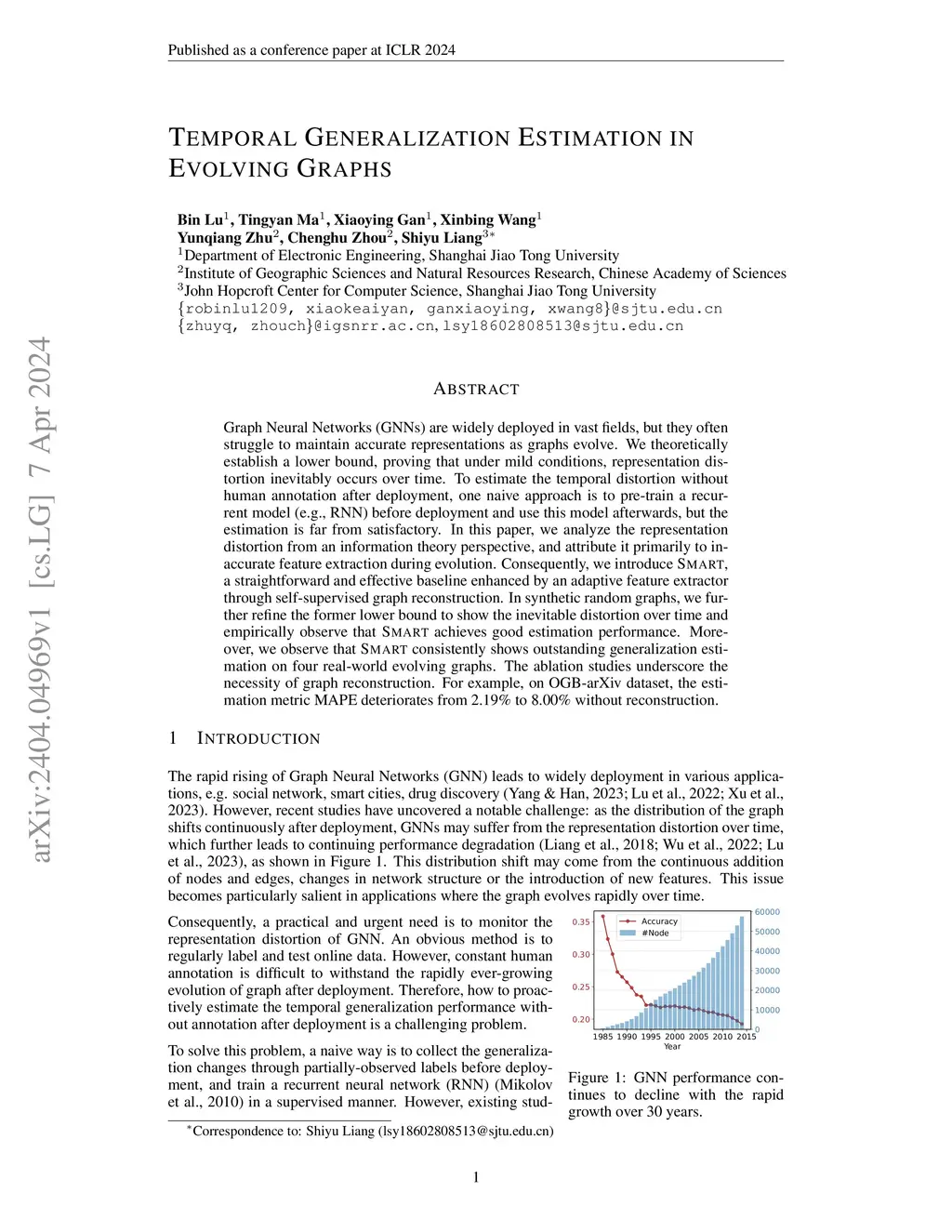Graph Neural Networks (GNNs) are widely deployed in vast fields, but they often struggle to maintain accurate representations as graphs evolve. We theoretically establish a lower bound, proving that under mild conditions, representation distortion inevitably occurs over time. To estimate the temporal distortion without human annotation after deployment, one naive approach is to pre-train a recurrent model (e.g., RNN) before deployment and use this model afterwards, but the estimation is far from satisfactory. In this paper, we analyze the representation distortion from an information theory perspective, and attribute it primarily to inaccurate feature extraction during evolution. Consequently, we introduce Smart, a straightforward and effective baseline enhanced by an adaptive feature extractor through self-supervised graph reconstruction. In synthetic random graphs, we further refine the former lower bound to show the inevitable distortion over time and empirically observe that Smart achieves good estimation performance. Moreover, we observe that Smart consistently shows outstanding generalization estimation on four real-world evolving graphs. The ablation studies underscore the necessity of graph reconstruction. For example, on OGB-arXiv dataset, the estimation metric MAPE deteriorates from 2.19% to 8.00% without reconstruction.
