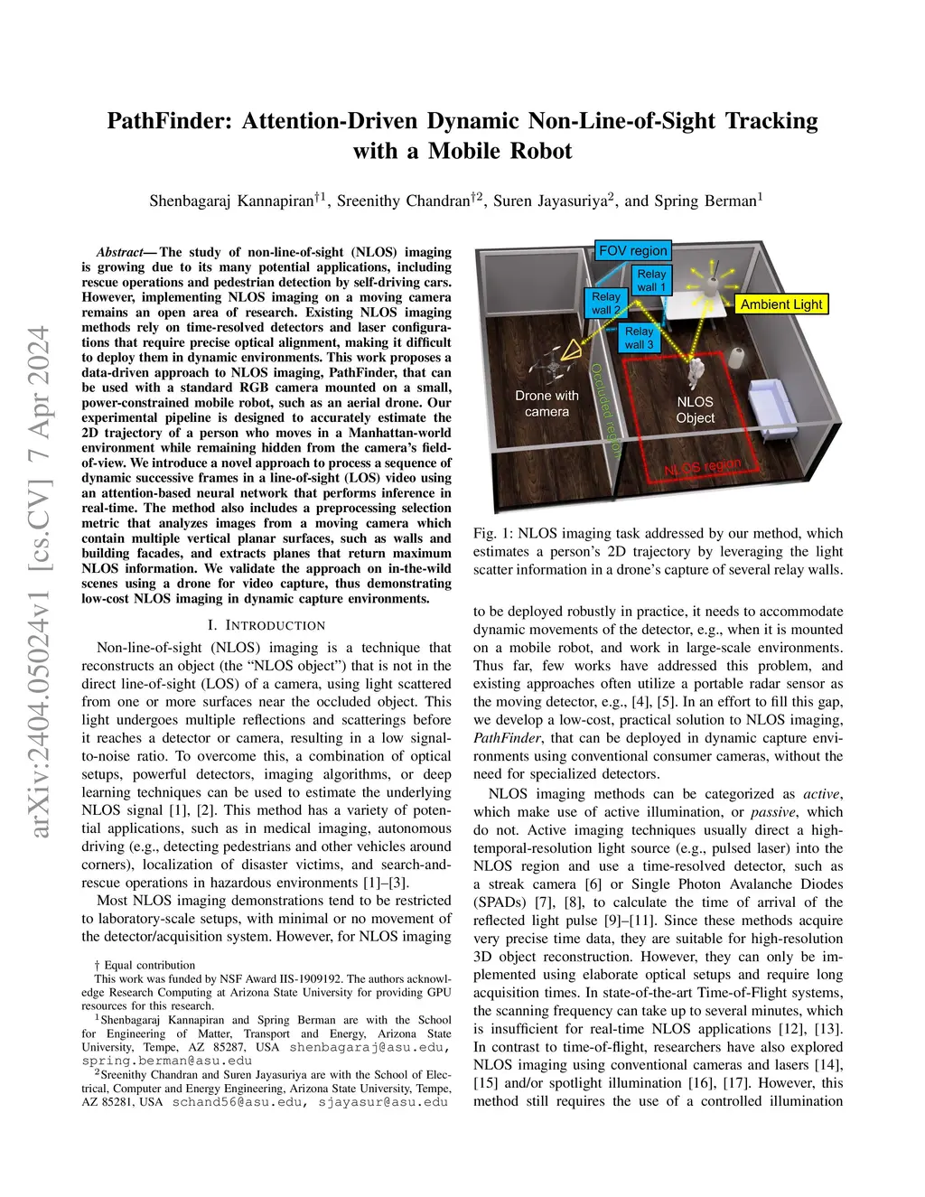 The study of non-line-of-sight (NLOS) imaging is growing due to its many potential applications, including rescue operations and pedestrian detection by self-driving cars. However, implementing NLOS imaging on a moving camera remains an open area of research. Existing NLOS imaging methods rely on time-resolved detectors and laser configurations that require precise optical alignment, making it difficult to deploy them in dynamic environments. This work proposes a data-driven approach to NLOS imaging, PathFinder, that can be used with a standard RGB camera mounted on a small, power-constrained mobile robot, such as an aerial drone. Our experimental pipeline is designed to accurately estimate the 2D trajectory of a person who moves in a Manhattan-world environment while remaining hidden from the camera's field-of-view. We introduce a novel approach to process a sequence of dynamic successive frames in a line-of-sight (LOS) video using an attention-based neural network that performs inference in real-time. The method also includes a preprocessing selection metric that analyzes images from a moving camera which contain multiple vertical planar surfaces, such as walls and building facades, and extracts planes that return maximum NLOS information. We validate the approach on in-the-wild scenes using a drone for video capture, thus demonstrating low-cost NLOS imaging in dynamic capture environments.