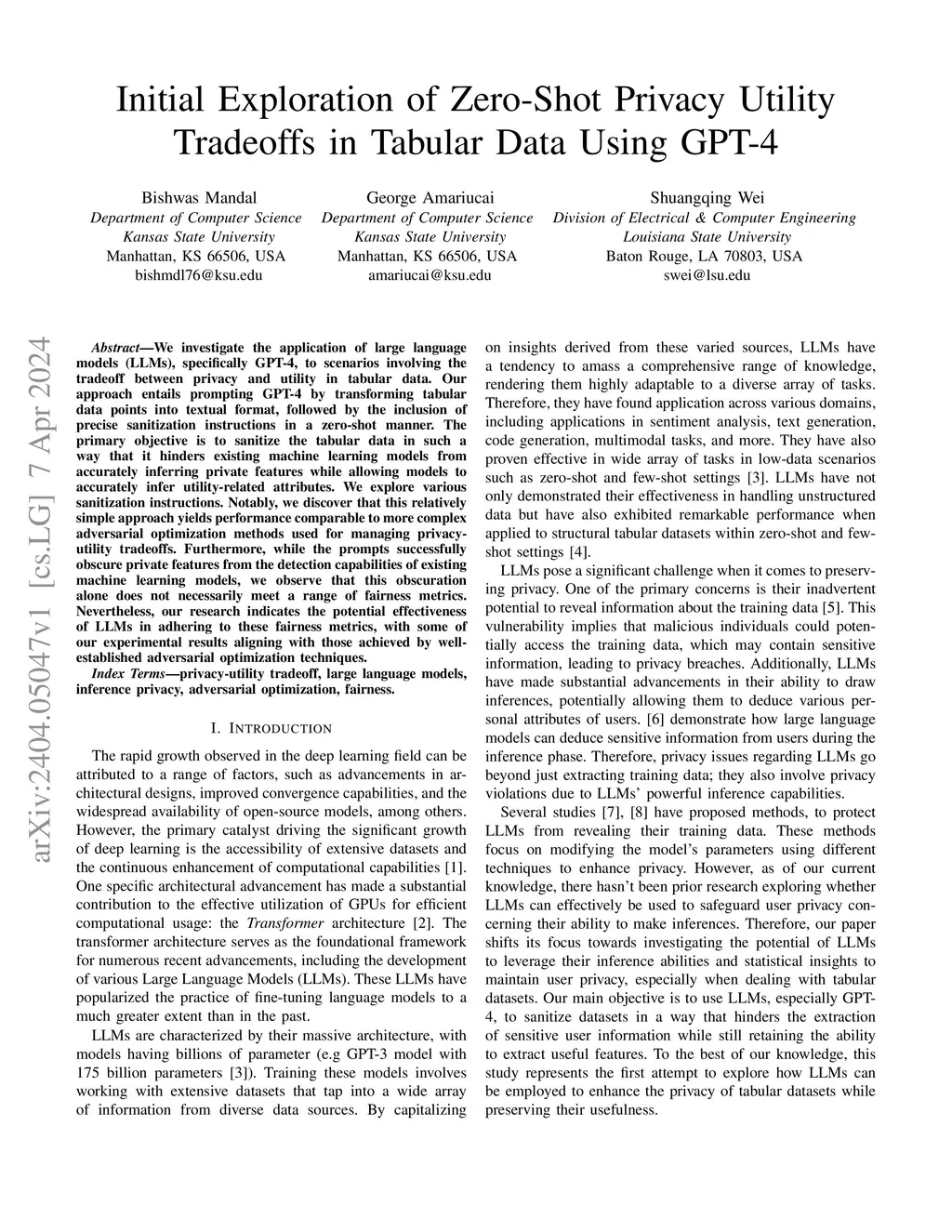 We investigate the application of large language models (LLMs), specifically GPT-4, to scenarios involving the tradeoff between privacy and utility in tabular data. Our approach entails prompting GPT-4 by transforming tabular data points into textual format, followed by the inclusion of precise sanitization instructions in a zero-shot manner. The primary objective is to sanitize the tabular data in such a way that it hinders existing machine learning models from accurately inferring private features while allowing models to accurately infer utility-related attributes. We explore various sanitization instructions. Notably, we discover that this relatively simple approach yields performance comparable to more complex adversarial optimization methods used for managing privacy-utility tradeoffs. Furthermore, while the prompts successfully obscure private features from the detection capabilities of existing machine learning models, we observe that this obscuration alone does not necessarily meet a range of fairness metrics. Nevertheless, our research indicates the potential effectiveness of LLMs in adhering to these fairness metrics, with some of our experimental results aligning with those achieved by well-established adversarial optimization techniques.