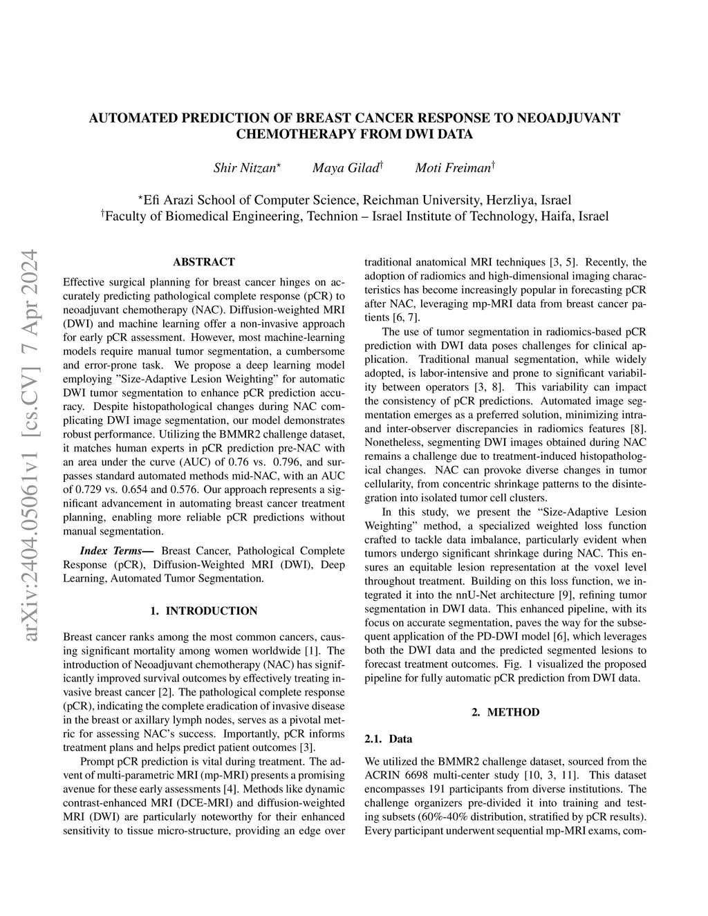 Effective surgical planning for breast cancer hinges on accurately predicting pathological complete response (pCR) to neoadjuvant chemotherapy (NAC). Diffusion-weighted MRI (DWI) and machine learning offer a non-invasive approach for early pCR assessment. However, most machine-learning models require manual tumor segmentation, a cumbersome and error-prone task. We propose a deep learning model employing "Size-Adaptive Lesion Weighting" for automatic DWI tumor segmentation to enhance pCR prediction accuracy. Despite histopathological changes during NAC complicating DWI image segmentation, our model demonstrates robust performance. Utilizing the BMMR2 challenge dataset, it matches human experts in pCR prediction pre-NAC with an area under the curve (AUC) of 0.76 vs. 0.796, and surpasses standard automated methods mid-NAC, with an AUC of 0.729 vs. 0.654 and 0.576. Our approach represents a significant advancement in automating breast cancer treatment planning, enabling more reliable pCR predictions without manual segmentation.