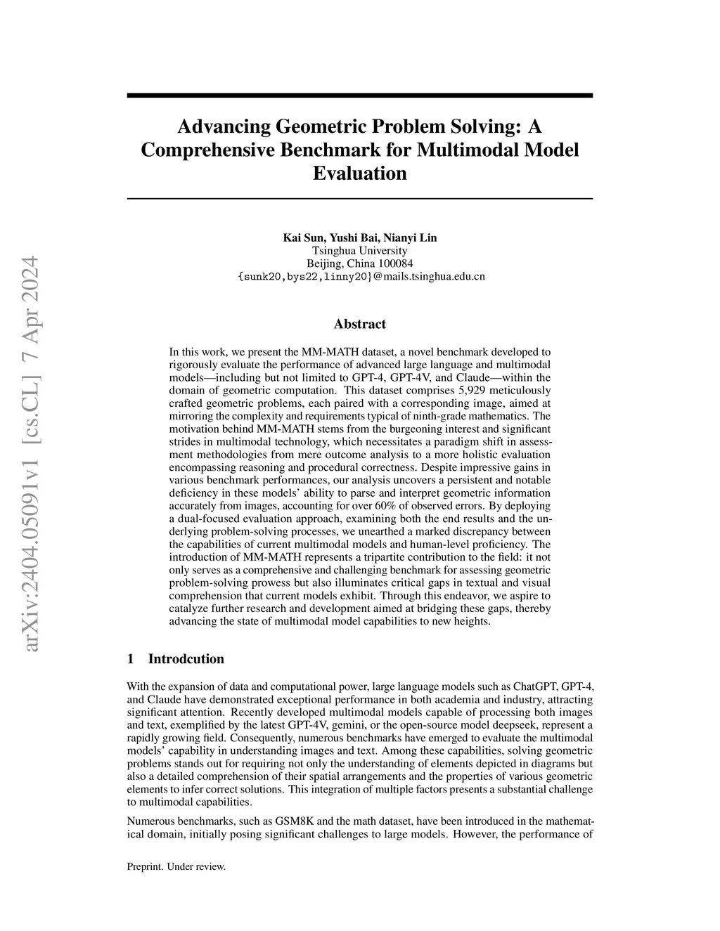 To advance the evaluation of multimodal math reasoning in large multimodal models (LMMs), this paper introduces a novel benchmark, MM-MATH. MM-MATH consists of 5,929 open-ended middle school math problems with visual contexts, with fine-grained classification across difficulty, grade level, and knowledge points. Unlike existing benchmarks relying on binary answer comparison, MM-MATH incorporates both outcome and process evaluations. Process evaluation employs LMM-as-a-judge to automatically analyze solution steps, identifying and categorizing errors into specific error types. Extensive evaluation of ten models on MM-MATH reveals significant challenges for existing LMMs, highlighting their limited utilization of visual information and struggles with higher-difficulty problems. The best-performing model achieves only 31% accuracy on MM-MATH, compared to 82% for humans. This highlights the challenging nature of our benchmark for existing models and the significant gap between the multimodal reasoning capabilities of current models and humans. Our process evaluation reveals that diagram misinterpretation is the most common error, accounting for more than half of the total error cases, underscoring the need for improved image comprehension in multimodal reasoning.