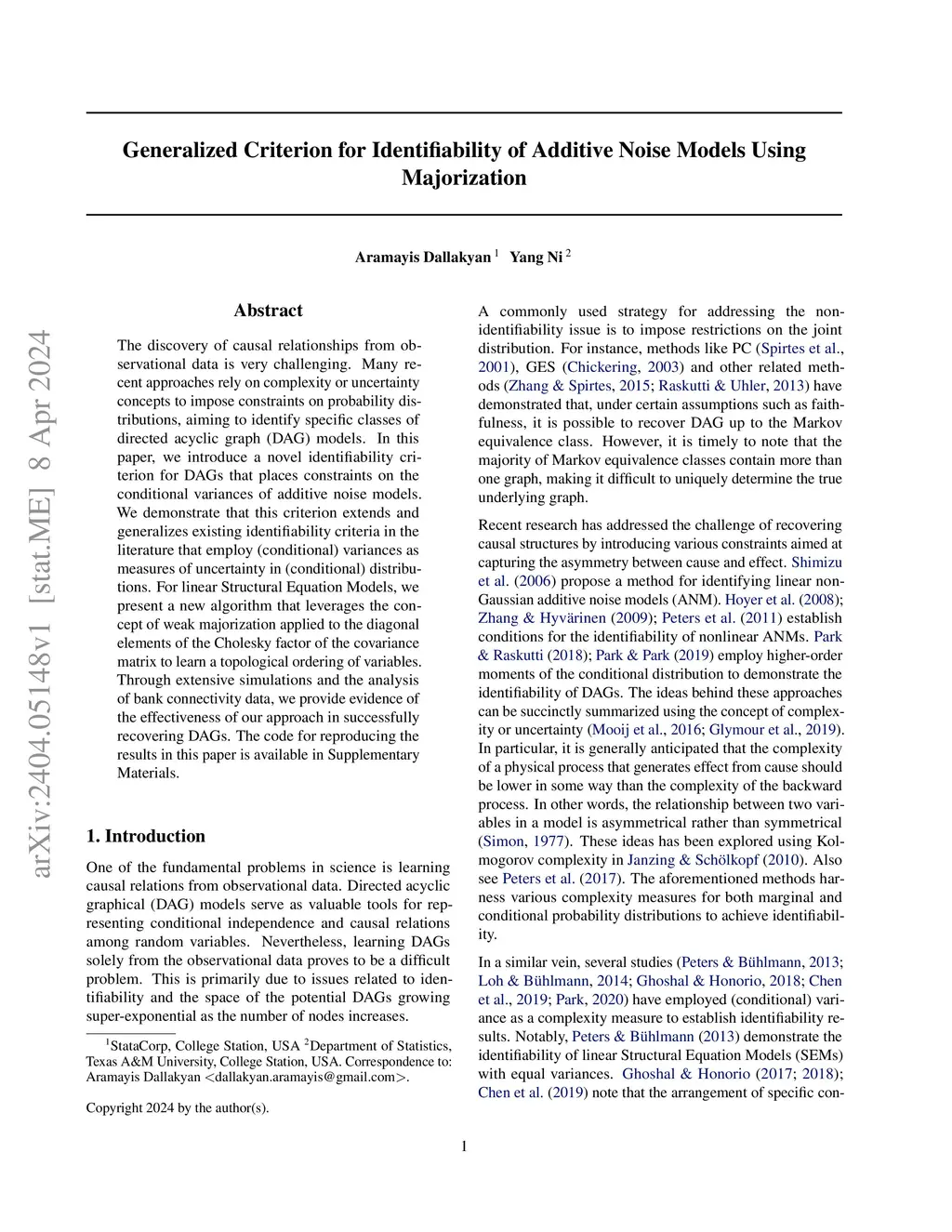 The discovery of causal relationships from observational data is very challenging. Many recent approaches rely on complexity or uncertainty concepts to impose constraints on probability distributions, aiming to identify specific classes of directed acyclic graph (DAG) models. In this paper, we introduce a novel identifiability criterion for DAGs that places constraints on the conditional variances of additive noise models. We demonstrate that this criterion extends and generalizes existing identifiability criteria in the literature that employ (conditional) variances as measures of uncertainty in (conditional) distributions. For linear Structural Equation Models, we present a new algorithm that leverages the concept of weak majorization applied to the diagonal elements of the Cholesky factor of the covariance matrix to learn a topological ordering of variables. Through extensive simulations and the analysis of bank connectivity data, we provide evidence of the effectiveness of our approach in successfully recovering DAGs. The code for reproducing the results in this paper is available in Supplementary Materials.