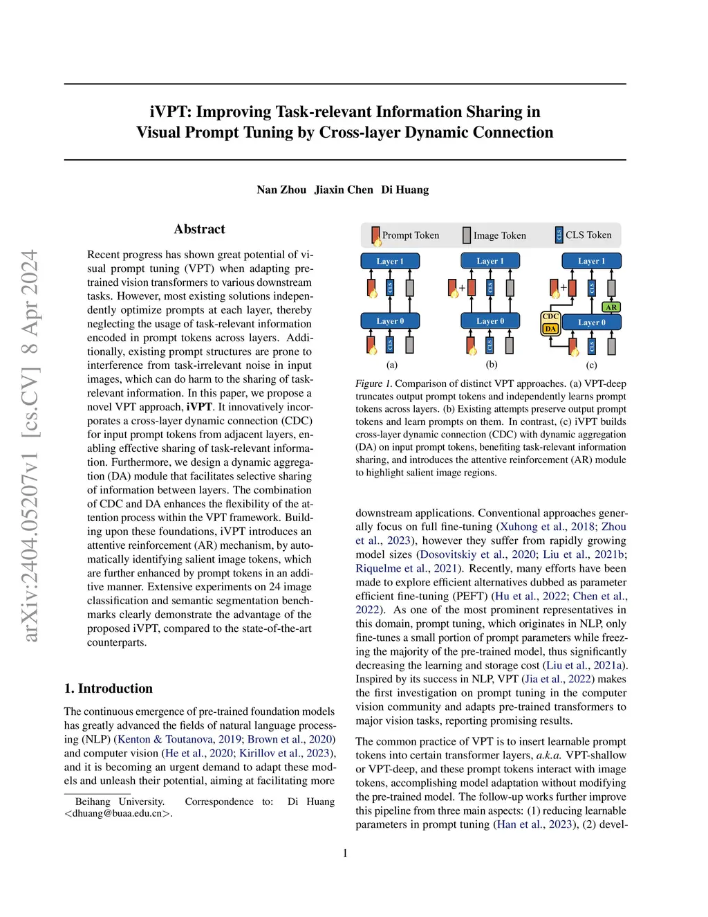 Recent progress has shown great potential of visual prompt tuning (VPT) when adapting pre-trained vision transformers to various downstream tasks. However, most existing solutions independently optimize prompts at each layer, thereby neglecting the usage of task-relevant information encoded in prompt tokens across layers. Additionally, existing prompt structures are prone to interference from task-irrelevant noise in input images, which can do harm to the sharing of task-relevant information. In this paper, we propose a novel VPT approach, \textbf{iVPT}. It innovatively incorporates a cross-layer dynamic connection (CDC) for input prompt tokens from adjacent layers, enabling effective sharing of task-relevant information. Furthermore, we design a dynamic aggregation (DA) module that facilitates selective sharing of information between layers. The combination of CDC and DA enhances the flexibility of the attention process within the VPT framework. Building upon these foundations, iVPT introduces an attentive reinforcement (AR) mechanism, by automatically identifying salient image tokens, which are further enhanced by prompt tokens in an additive manner. Extensive experiments on 24 image classification and semantic segmentation benchmarks clearly demonstrate the advantage of the proposed iVPT, compared to the state-of-the-art counterparts.