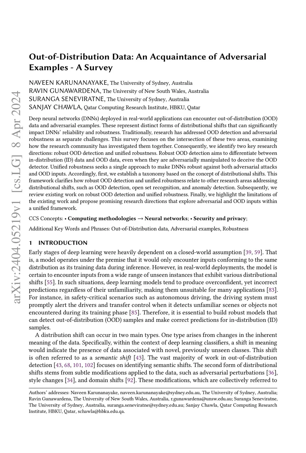 Deep neural networks (DNNs) deployed in real-world applications can encounter out-of-distribution (OOD) data and adversarial examples. These represent distinct forms of distributional shifts that can significantly impact DNNs' reliability and robustness. Traditionally, research has addressed OOD detection and adversarial robustness as separate challenges. This survey focuses on the intersection of these two areas, examining how the research community has investigated them together. Consequently, we identify two key research directions: robust OOD detection and unified robustness. Robust OOD detection aims to differentiate between in-distribution (ID) data and OOD data, even when they are adversarially manipulated to deceive the OOD detector. Unified robustness seeks a single approach to make DNNs robust against both adversarial attacks and OOD inputs. Accordingly, first, we establish a taxonomy based on the concept of distributional shifts. This framework clarifies how robust OOD detection and unified robustness relate to other research areas addressing distributional shifts, such as OOD detection, open set recognition, and anomaly detection. Subsequently, we review existing work on robust OOD detection and unified robustness. Finally, we highlight the limitations of the existing work and propose promising research directions that explore adversarial and OOD inputs within a unified framework.