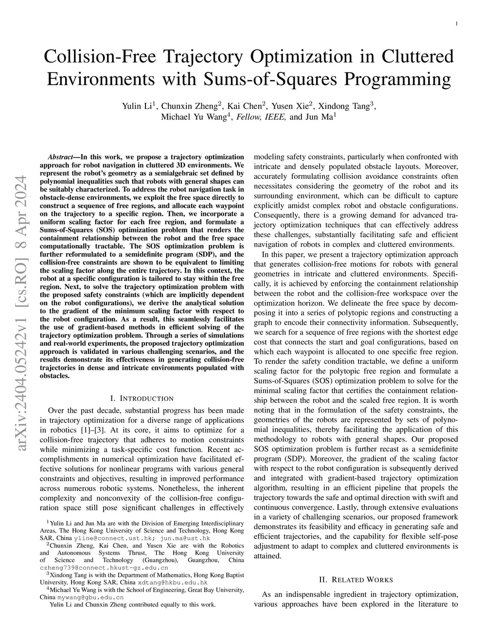 In this work, we propose a trajectory optimization approach for robot navigation in cluttered 3D environments. We represent the robot's geometry as a semialgebraic set defined by polynomial inequalities such that robots with general shapes can be suitably characterized. To address the robot navigation task in obstacle-dense environments, we exploit the free space directly to construct a sequence of free regions, and allocate each waypoint on the trajectory to a specific region. Then, we incorporate a uniform scaling factor for each free region, and formulate a Sums-of-Squares (SOS) optimization problem that renders the containment relationship between the robot and the free space computationally tractable. The SOS optimization problem is further reformulated to a semidefinite program (SDP), and the collision-free constraints are shown to be equivalent to limiting the scaling factor along the entire trajectory. In this context, the robot at a specific configuration is tailored to stay within the free region. Next, to solve the trajectory optimization problem with the proposed safety constraints (which are implicitly dependent on the robot configurations), we derive the analytical solution to the gradient of the minimum scaling factor with respect to the robot configuration. As a result, this seamlessly facilitates the use of gradient-based methods in efficient solving of the trajectory optimization problem. Through a series of simulations and real-world experiments, the proposed trajectory optimization approach is validated in various challenging scenarios, and the results demonstrate its effectiveness in generating collision-free trajectories in dense and intricate environments populated with obstacles.