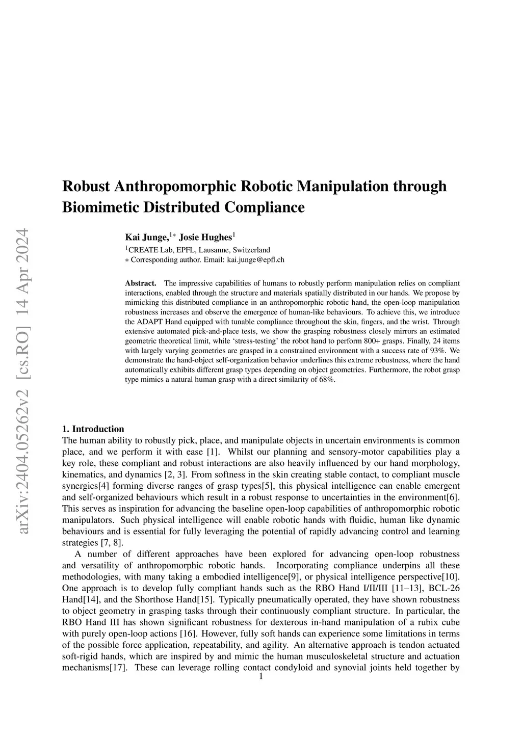 The impressive capabilities of humans to robustly perform manipulation relies on compliant interactions, enabled through the structure and materials spatially distributed in our hands. We propose by mimicking this distributed compliance in an anthropomorphic robotic hand, the open-loop manipulation robustness increases and observe the emergence of human-like behaviours. To achieve this, we introduce the ADAPT Hand equipped with tunable compliance throughout the skin, fingers, and the wrist. Through extensive automated pick-and-place tests, we show the grasping robustness closely mirrors an estimated geometric theoretical limit, while `stress-testing' the robot hand to perform 800+ grasps. Finally, 24 items with largely varying geometries are grasped in a constrained environment with a success rate of 93%. We demonstrate the hand-object self-organization behavior underlines this extreme robustness, where the hand automatically exhibits different grasp types depending on object geometries. Furthermore, the robot grasp type mimics a natural human grasp with a direct similarity of 68%.