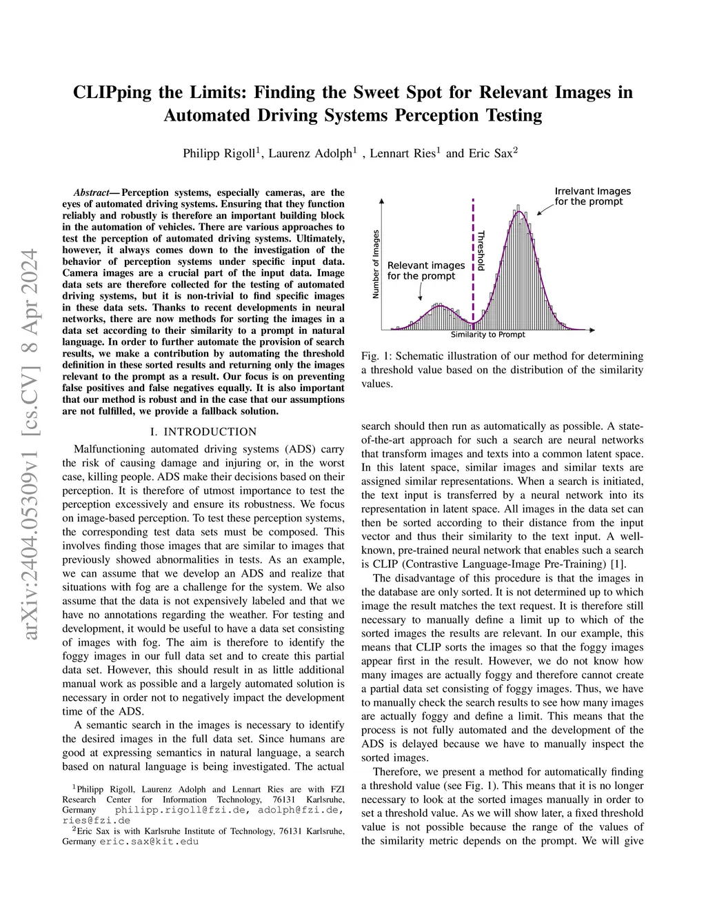 Perception systems, especially cameras, are the eyes of automated driving systems. Ensuring that they function reliably and robustly is therefore an important building block in the automation of vehicles. There are various approaches to test the perception of automated driving systems. Ultimately, however, it always comes down to the investigation of the behavior of perception systems under specific input data. Camera images are a crucial part of the input data. Image data sets are therefore collected for the testing of automated driving systems, but it is non-trivial to find specific images in these data sets. Thanks to recent developments in neural networks, there are now methods for sorting the images in a data set according to their similarity to a prompt in natural language. In order to further automate the provision of search results, we make a contribution by automating the threshold definition in these sorted results and returning only the images relevant to the prompt as a result. Our focus is on preventing false positives and false negatives equally. It is also important that our method is robust and in the case that our assumptions are not fulfilled, we provide a fallback solution.
