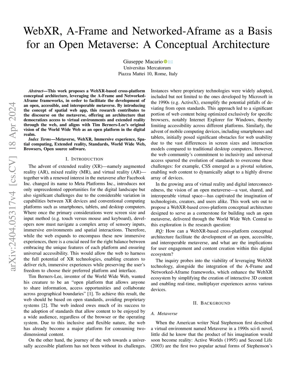 This work proposes a WebXR-based cross-platform conceptual architecture, leveraging the A-Frame and Networked-Aframe frameworks, in order to facilitate the development of an open, accessible, and interoperable metaverse. By introducing the concept of spatial web app, this research contributes to the discourse on the metaverse, offering an architecture that democratizes access to virtual environments and extended reality through the web, and aligns with Tim Berners-Lee's original vision of the World Wide Web as an open platform in the digital realm.