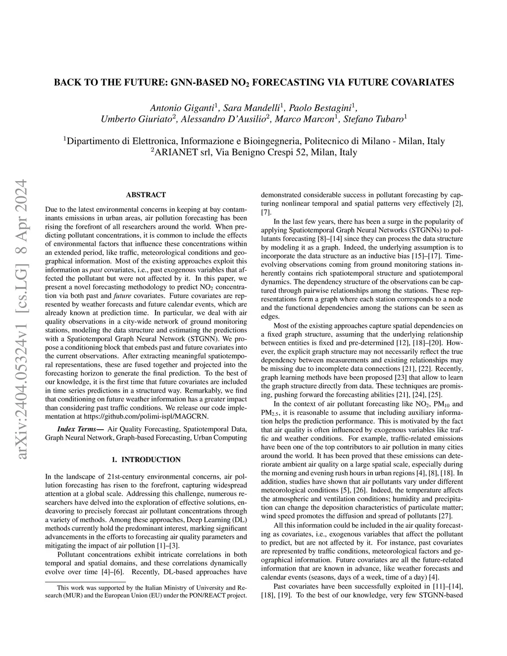 Due to the latest environmental concerns in keeping at bay contaminants emissions in urban areas, air pollution forecasting has been rising the forefront of all researchers around the world. When predicting pollutant concentrations, it is common to include the effects of environmental factors that influence these concentrations within an extended period, like traffic, meteorological conditions and geographical information. Most of the existing approaches exploit this information as past covariates, i.e., past exogenous variables that affected the pollutant but were not affected by it. In this paper, we present a novel forecasting methodology to predict NO concentration via both past and future covariates. Future covariates are represented by weather forecasts and future calendar events, which are already known at prediction time. In particular, we deal with air quality observations in a city-wide network of ground monitoring stations, modeling the data structure and estimating the predictions with a Spatiotemporal Graph Neural Network (STGNN). We propose a conditioning block that embeds past and future covariates into the current observations. After extracting meaningful spatiotemporal representations, these are fused together and projected into the forecasting horizon to generate the final prediction. To the best of our knowledge, it is the first time that future covariates are included in time series predictions in a structured way. Remarkably, we find that conditioning on future weather information has a greater impact than considering past traffic conditions. We release our code implementation at https://github.com/polimi-ispl/MAGCRN.