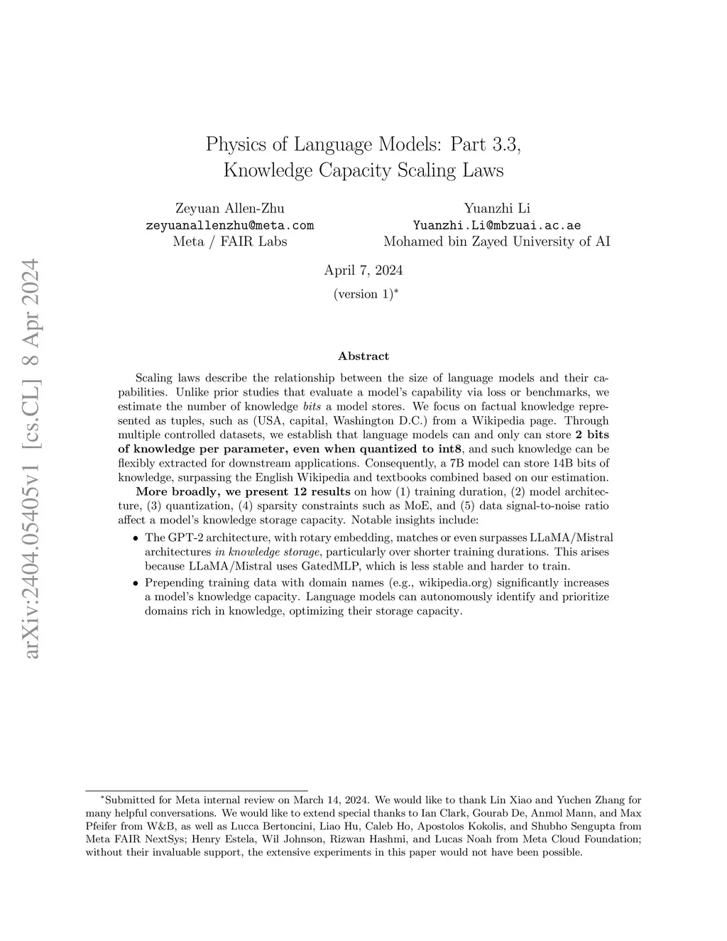 Scaling laws describe the relationship between the size of language models and their capabilities. Unlike prior studies that evaluate a model's capability via loss or benchmarks, we estimate the number of knowledge bits a model stores. We focus on factual knowledge represented as tuples, such as (USA, capital, Washington D.C.) from a Wikipedia page. Through multiple controlled datasets, we establish that language models can and only can store 2 bits of knowledge per parameter, even when quantized to int8, and such knowledge can be flexibly extracted for downstream applications. Consequently, a 7B model can store 14B bits of knowledge, surpassing the English Wikipedia and textbooks combined based on our estimation. More broadly, we present 12 results on how (1) training duration, (2) model architecture, (3) quantization, (4) sparsity constraints such as MoE, and (5) data signal-to-noise ratio affect a model's knowledge storage capacity. Notable insights include: * The GPT-2 architecture, with rotary embedding, matches or even surpasses LLaMA/Mistral architectures in knowledge storage, particularly over shorter training durations. This arises because LLaMA/Mistral uses GatedMLP, which is less stable and harder to train. * Prepending training data with domain names (e.g., wikipedia.org) significantly increases a model's knowledge capacity. Language models can autonomously identify and prioritize domains rich in knowledge, optimizing their storage capacity.
