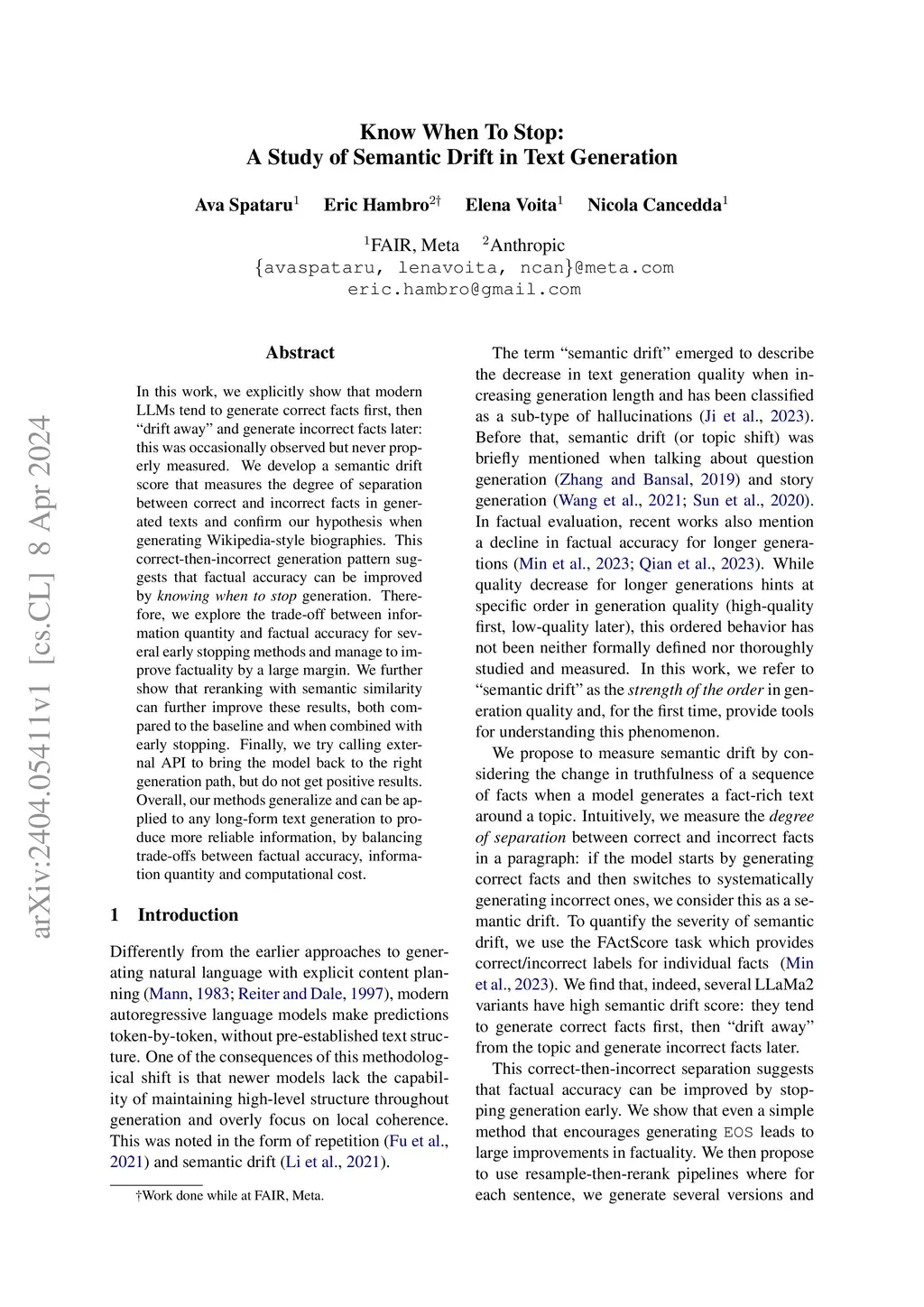 In this work, we explicitly show that modern LLMs tend to generate correct facts first, then "drift away" and generate incorrect facts later: this was occasionally observed but never properly measured. We develop a semantic drift score that measures the degree of separation between correct and incorrect facts in generated texts and confirm our hypothesis when generating Wikipedia-style biographies. This correct-then-incorrect generation pattern suggests that factual accuracy can be improved by knowing when to stop generation. Therefore, we explore the trade-off between information quantity and factual accuracy for several early stopping methods and manage to improve factuality by a large margin. We further show that reranking with semantic similarity can further improve these results, both compared to the baseline and when combined with early stopping. Finally, we try calling external API to bring the model back to the right generation path, but do not get positive results. Overall, our methods generalize and can be applied to any long-form text generation to produce more reliable information, by balancing trade-offs between factual accuracy, information quantity and computational cost.