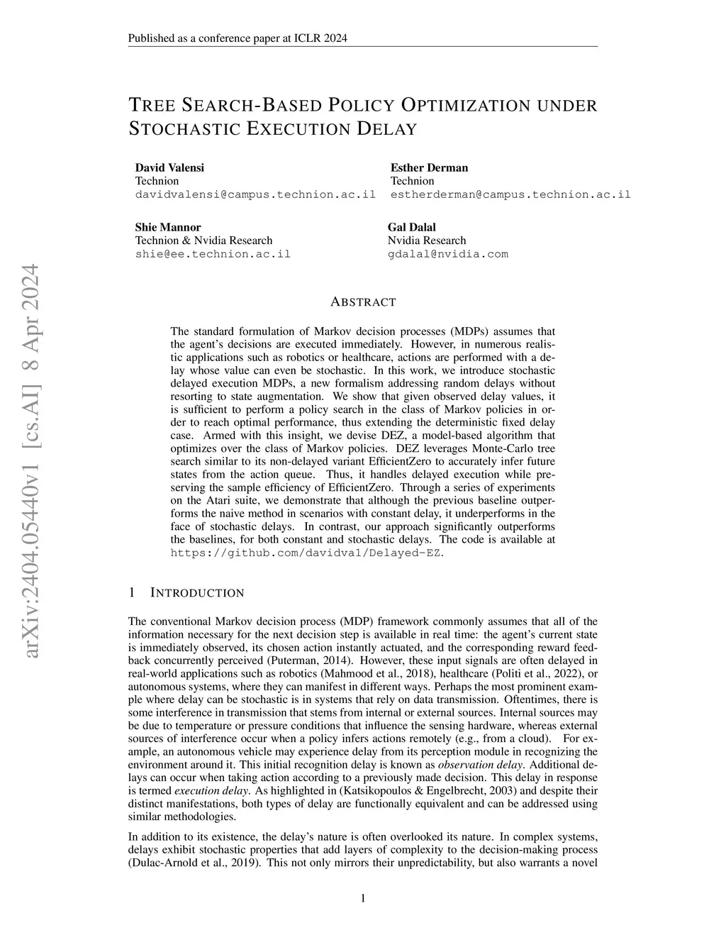 The standard formulation of Markov decision processes (MDPs) assumes that the agent's decisions are executed immediately. However, in numerous realistic applications such as robotics or healthcare, actions are performed with a delay whose value can even be stochastic. In this work, we introduce stochastic delayed execution MDPs, a new formalism addressing random delays without resorting to state augmentation. We show that given observed delay values, it is sufficient to perform a policy search in the class of Markov policies in order to reach optimal performance, thus extending the deterministic fixed delay case. Armed with this insight, we devise DEZ, a model-based algorithm that optimizes over the class of Markov policies. DEZ leverages Monte-Carlo tree search similar to its non-delayed variant EfficientZero to accurately infer future states from the action queue. Thus, it handles delayed execution while preserving the sample efficiency of EfficientZero. Through a series of experiments on the Atari suite, we demonstrate that although the previous baseline outperforms the naive method in scenarios with constant delay, it underperforms in the face of stochastic delays. In contrast, our approach significantly outperforms the baselines, for both constant and stochastic delays. The code is available at http://github.com/davidva1/Delayed-EZ .