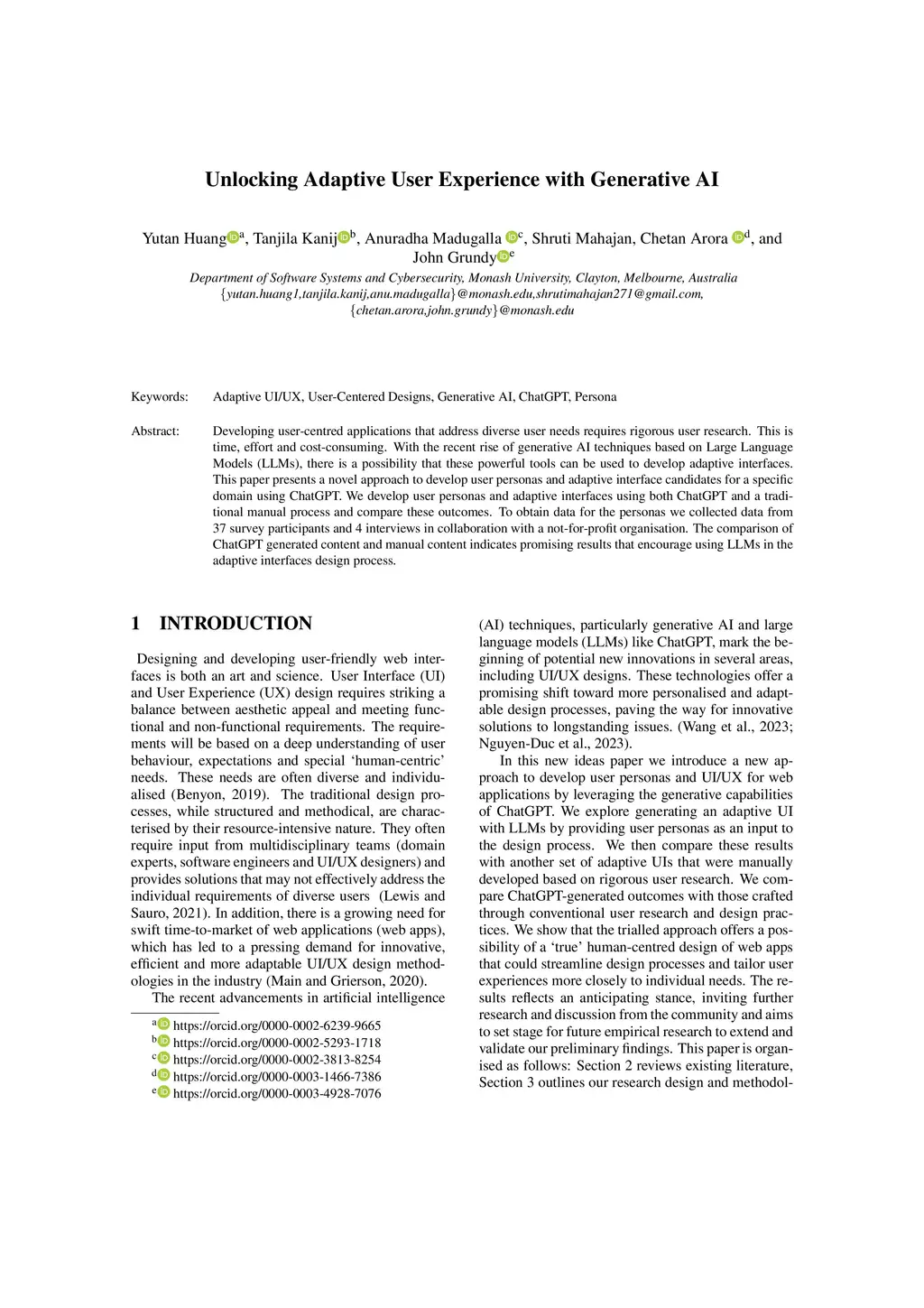 Developing user-centred applications that address diverse user needs requires rigorous user research. This is time, effort and cost-consuming. With the recent rise of generative AI techniques based on Large Language Models (LLMs), there is a possibility that these powerful tools can be used to develop adaptive interfaces. This paper presents a novel approach to develop user personas and adaptive interface candidates for a specific domain using ChatGPT. We develop user personas and adaptive interfaces using both ChatGPT and a traditional manual process and compare these outcomes. To obtain data for the personas we collected data from 37 survey participants and 4 interviews in collaboration with a not-for-profit organisation. The comparison of ChatGPT generated content and manual content indicates promising results that encourage using LLMs in the adaptive interfaces design process.