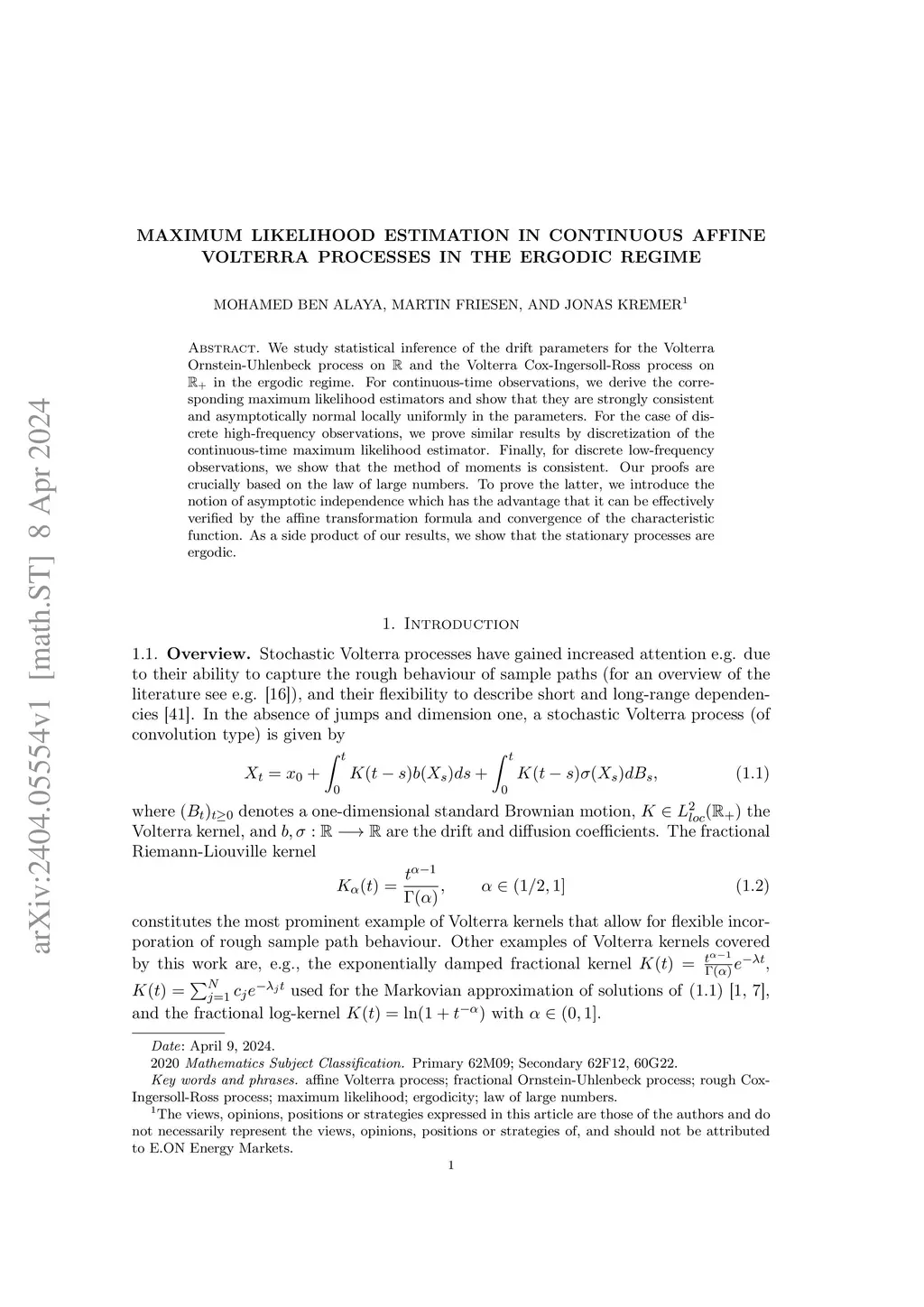 We study statistical inference of the drift parameters for the Volterra Ornstein-Uhlenbeck process on R and the Volterra Cox-Ingersoll-Ross process on R+ in the ergodic regime. For continuous-time observations, we derive the corresponding maximum likelihood estimators and show that they are strongly consistent and asymptotically normal locally uniformly in the parameters. For the case of discrete high-frequency observations, we prove similar results by discretization of the continuous-time maximum likelihood estimator. Finally, for discrete low-frequency observations, we show that the method of moments is consistent. Our proofs are crucially based on the law of large numbers. To prove the latter, we introduce the notion of asymptotic independence which has the advantage that it can be effectively verified by the affine transformation formula and convergence of the characteristic function. As a side product of our results, we show that the stationary processes are ergodic.