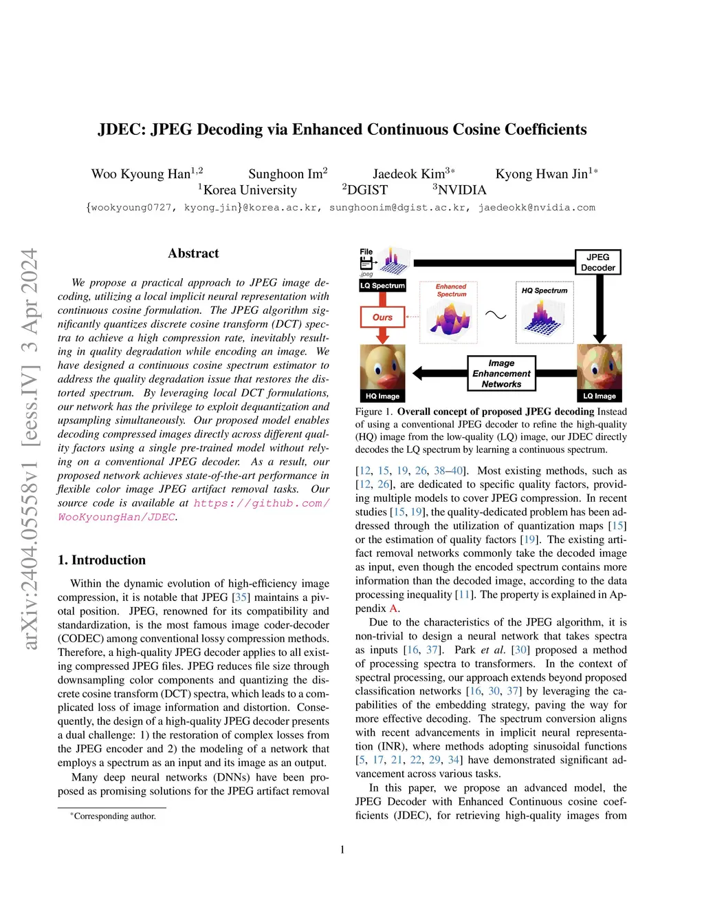 JDEC: JPEG Decoding via Enhanced Continuous Cosine Coefficients