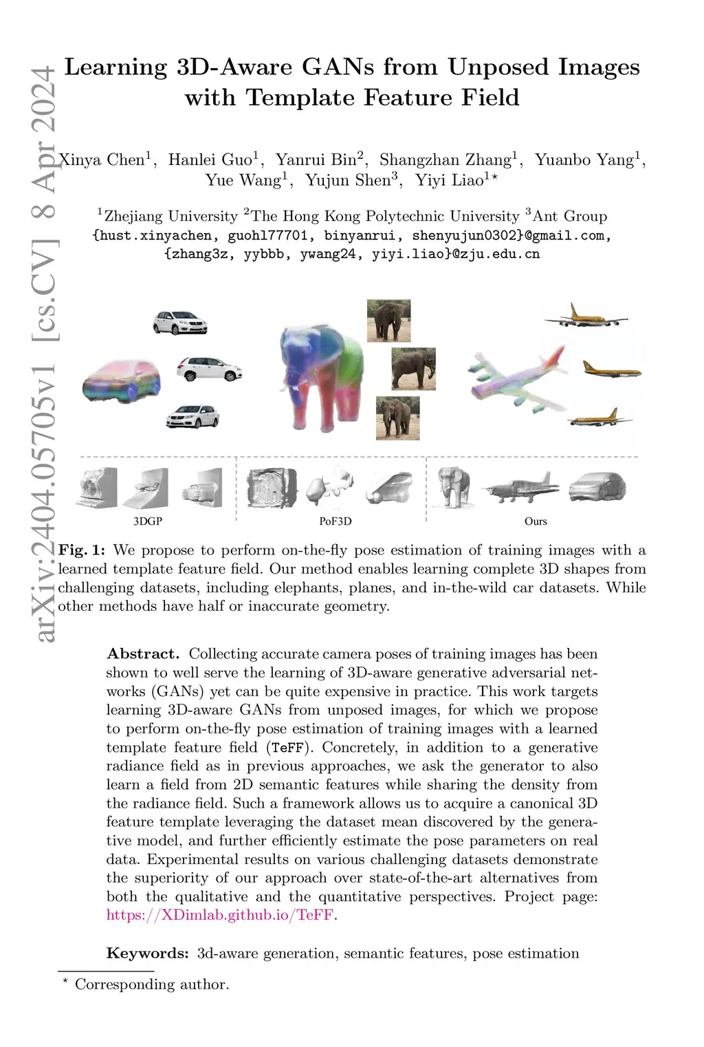 Collecting accurate camera poses of training images has been shown to well serve the learning of 3D-aware generative adversarial networks (GANs) yet can be quite expensive in practice. This work targets learning 3D-aware GANs from unposed images, for which we propose to perform on-the-fly pose estimation of training images with a learned template feature field (TeFF). Concretely, in addition to a generative radiance field as in previous approaches, we ask the generator to also learn a field from 2D semantic features while sharing the density from the radiance field. Such a framework allows us to acquire a canonical 3D feature template leveraging the dataset mean discovered by the generative model, and further efficiently estimate the pose parameters on real data. Experimental results on various challenging datasets demonstrate the superiority of our approach over state-of-the-art alternatives from both the qualitative and the quantitative perspectives.