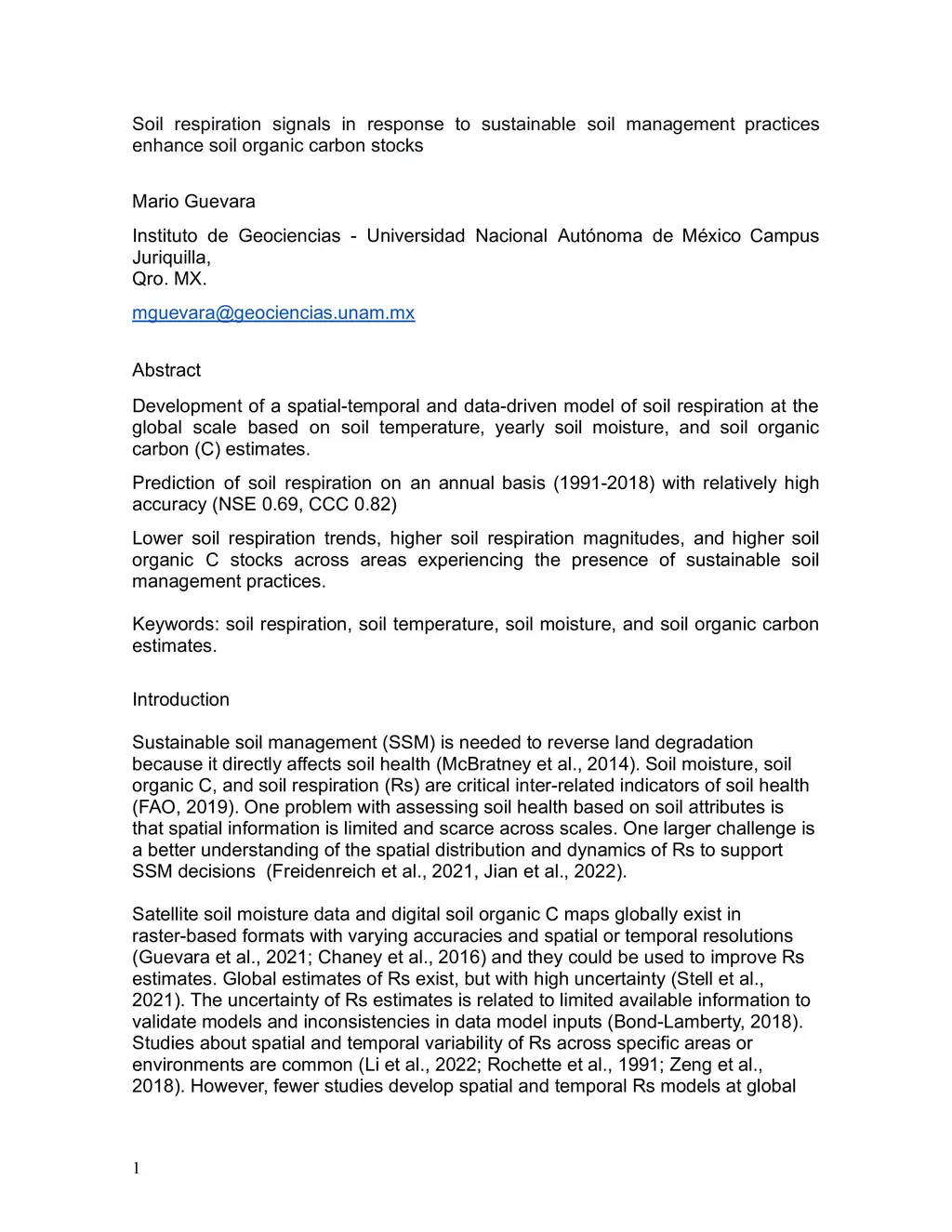Development of a spatial-temporal and data-driven model of soil respiration at the global scale based on soil temperature, yearly soil moisture, and soil organic carbon (C) estimates. Prediction of soil respiration on an annual basis (1991-2018) with relatively high accuracy (NSE 0.69, CCC 0.82). Lower soil respiration trends, higher soil respiration magnitudes, and higher soil organic C stocks across areas experiencing the presence of sustainable soil management practices.